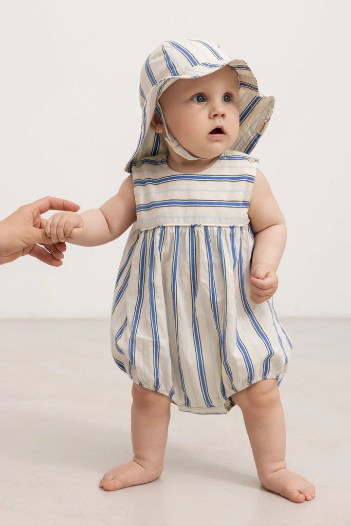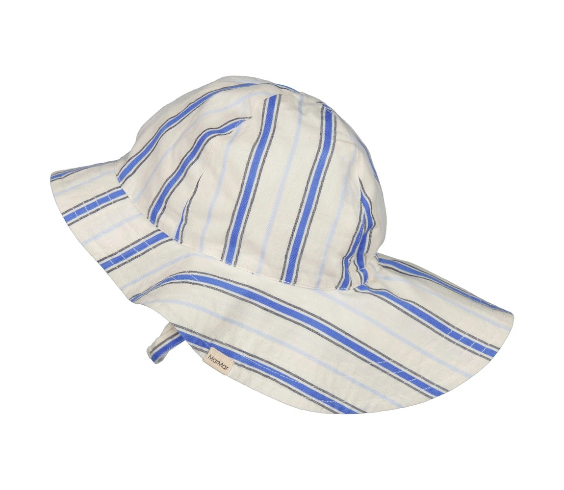 Summer hat with fine stripes, brim and elastic strap under the chin that closes with a button in several lengths.