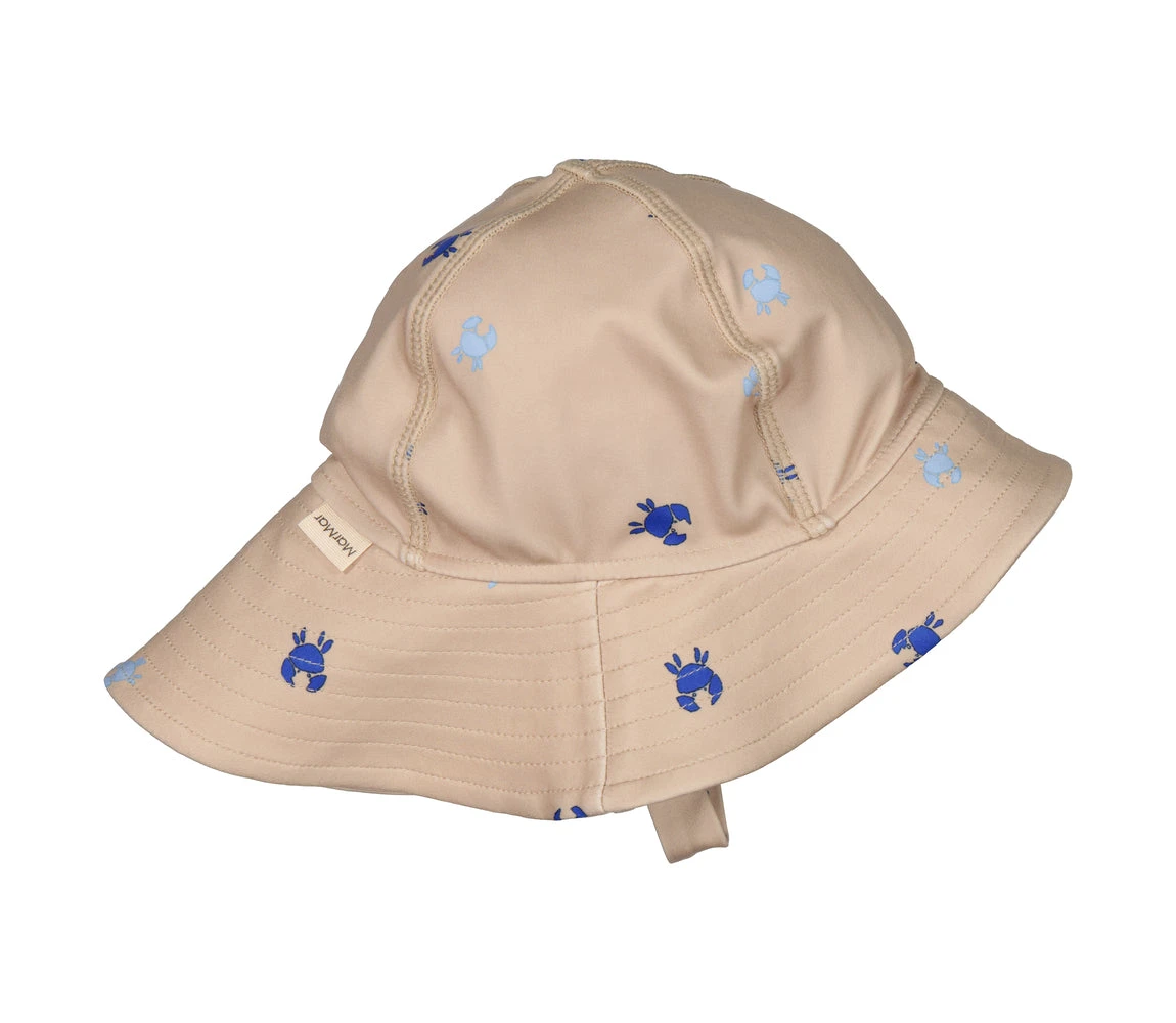 Swimming sun hat with a wide brim that is longer at the neck. The swimming sun hat has a strap with button closure in two lengths. The swimming sun hat has a nice crab print