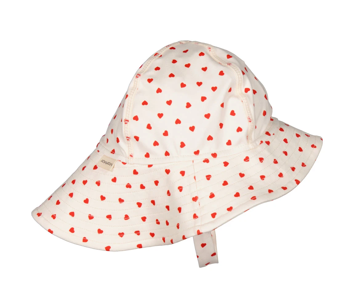 Swimming sun hat with a wide brim that is longer at the neck. Strap with button closure in two lengths. The swimming sun hat has a nice heart print