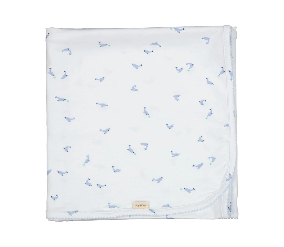 Baby blanket with rounded corners and a nice dolphin print with picot edges. The blanket measures 80 x 80 cm and is both soft, stretchy and comfortable to wear.