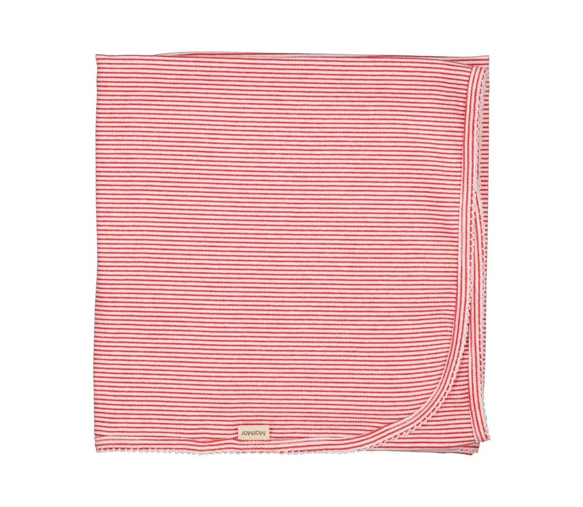 Baby blanket with rounded corners and fine stripes. The blanket measures 80 x 80 cm and is both soft, stretchy and comfortable to wear.
