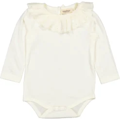 Long-sleeved bodystocking with a round collar and lace details. The bodystocking closes with buttons at the back. The bodystocking is soft, stretchy and comfortable to wear.