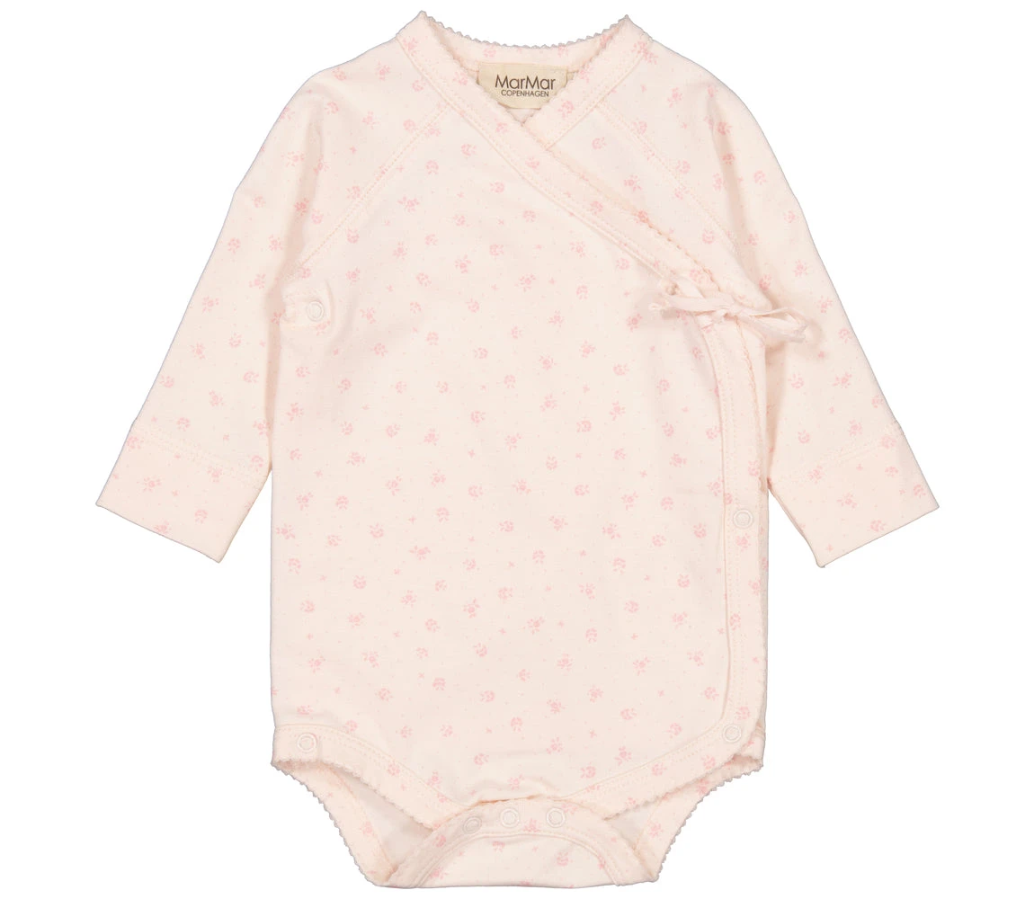 Long-sleeved bodystocking for newborns with a wrap-around closure and a cute floral print. The bodystocking closes with snaps and ties, has picot edges and is both soft, stretchy and comfortable to wear.