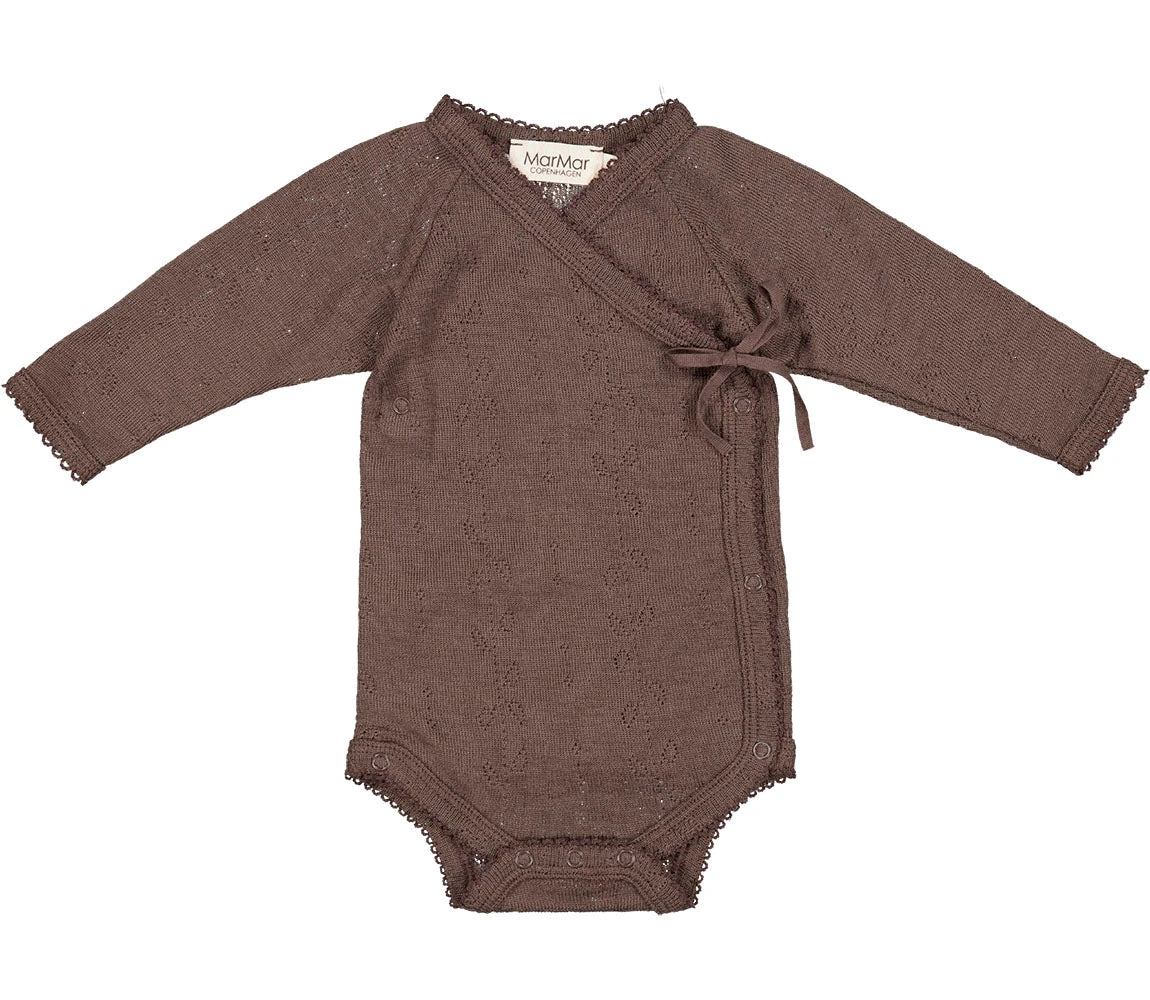 Long-sleeved bodystocking for newborns with wrap-around closure. Closes with snaps and ties.