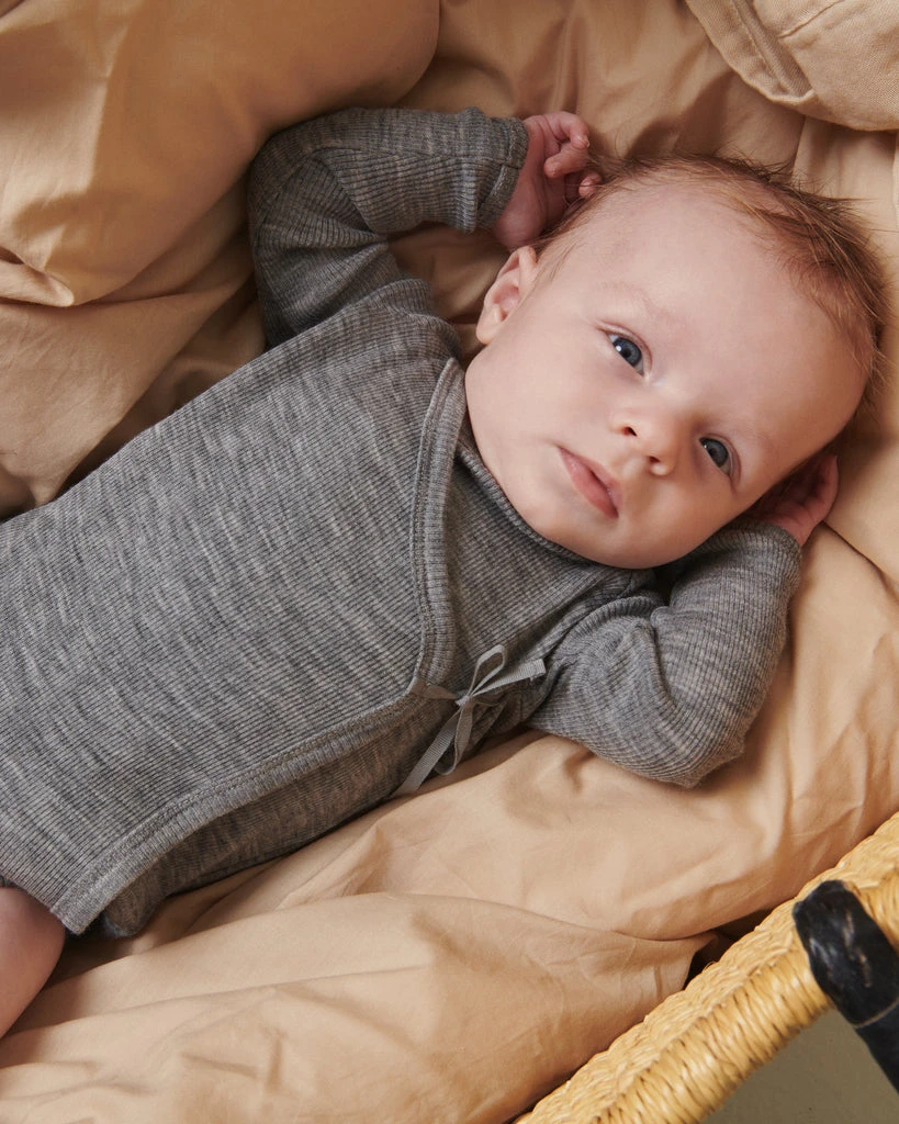 Long-sleeved bodystocking for newborns with wrap-around closure. Closes with snaps and ties.