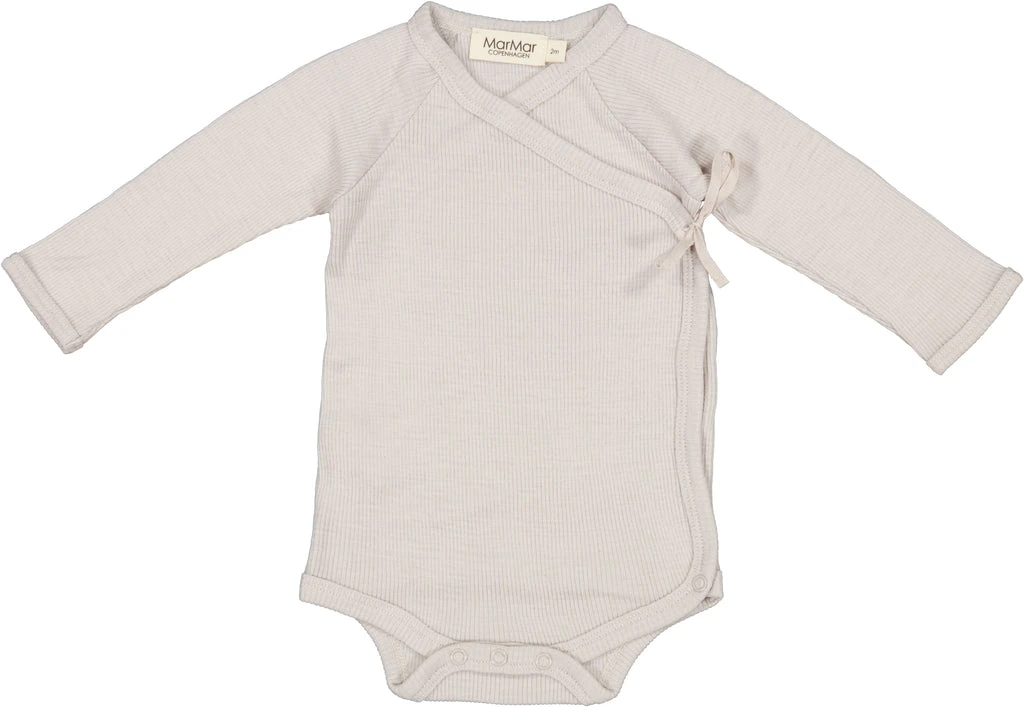 Long-sleeved bodystocking for newborns with wrap-around closure. Closes with snaps and ties.