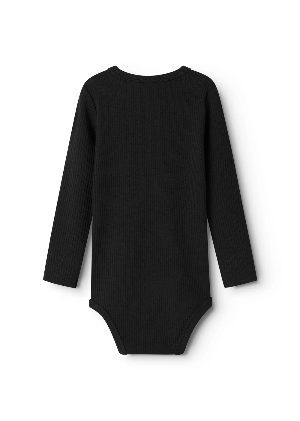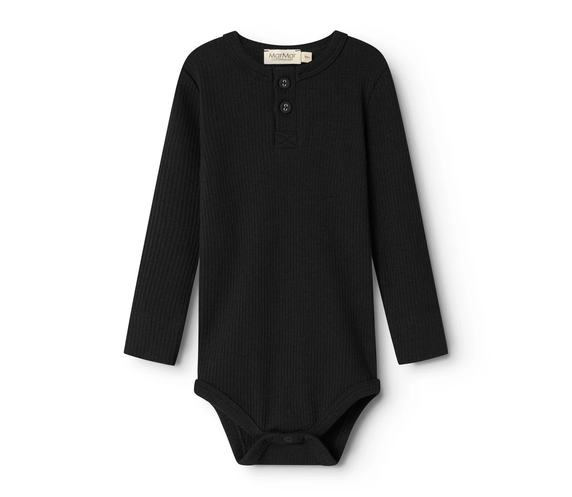 Long-sleeved baby modal bodystocking with placket button closure that is closed with snaps between the legs for easy diaper changes.