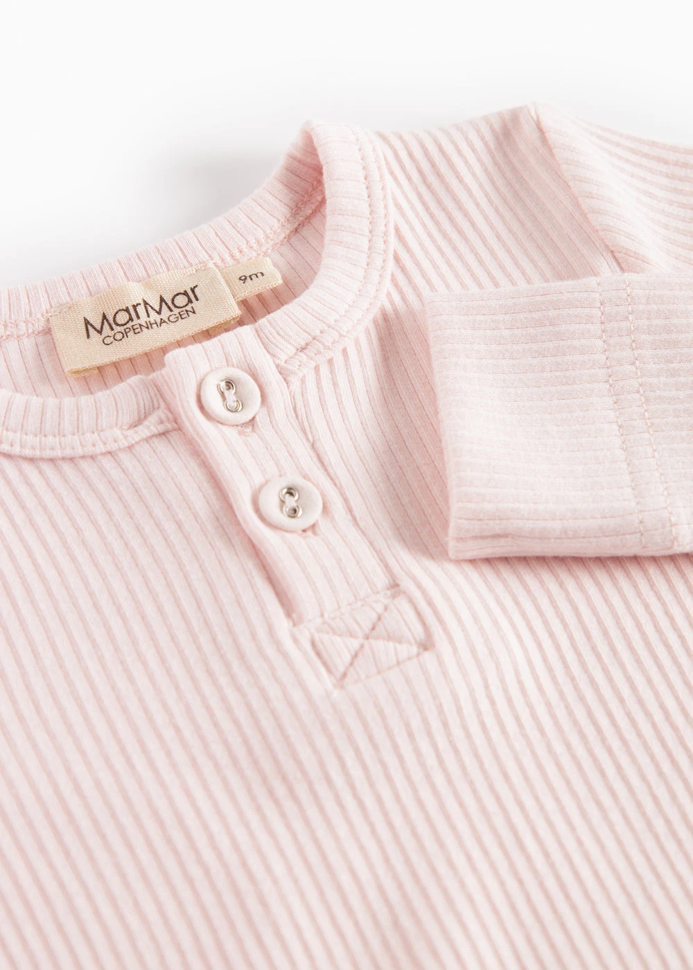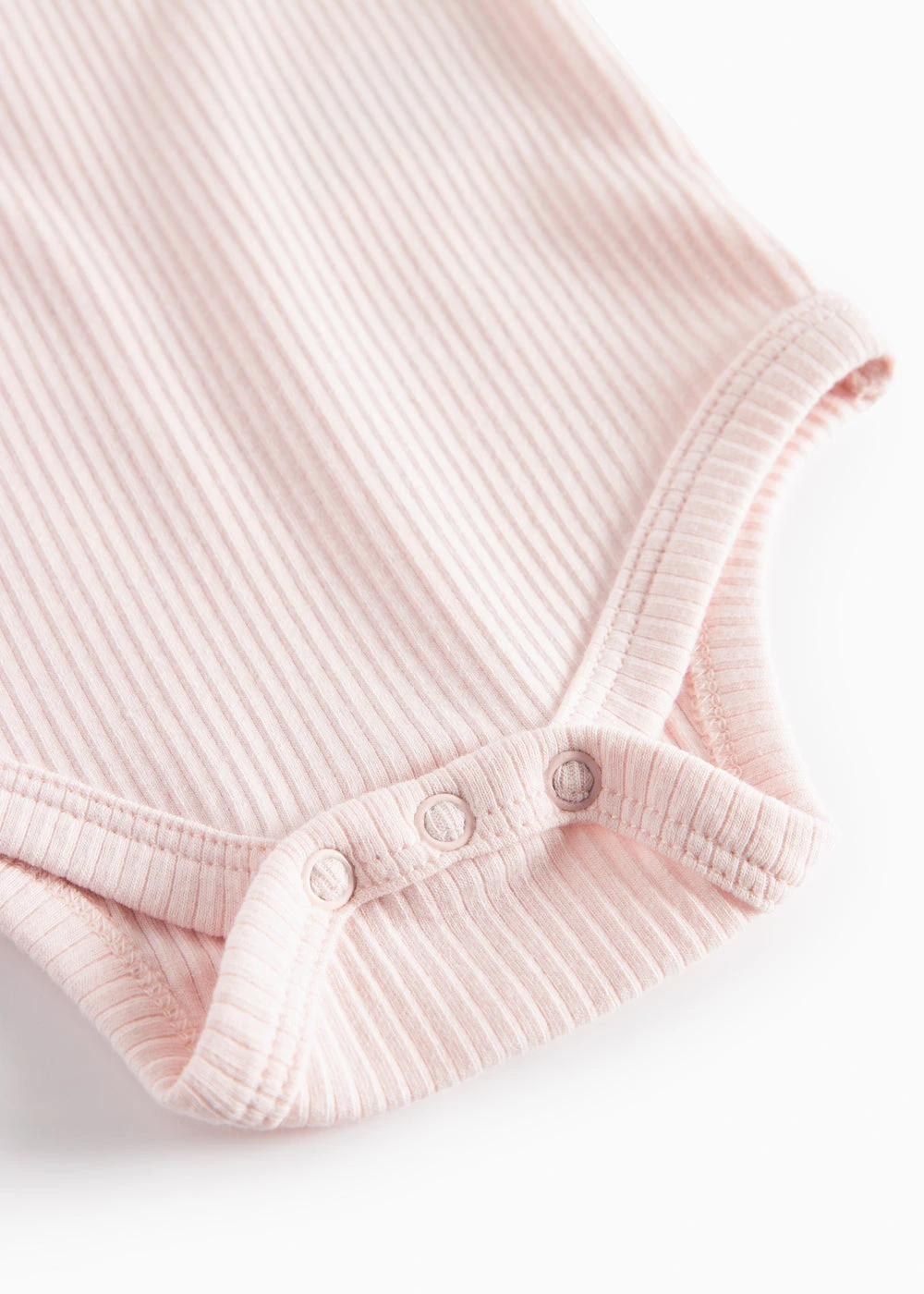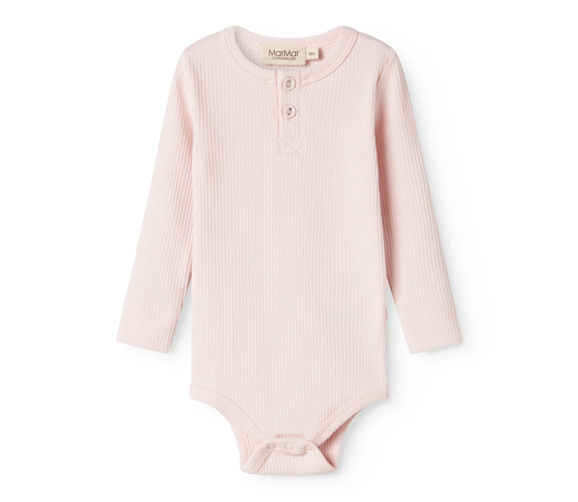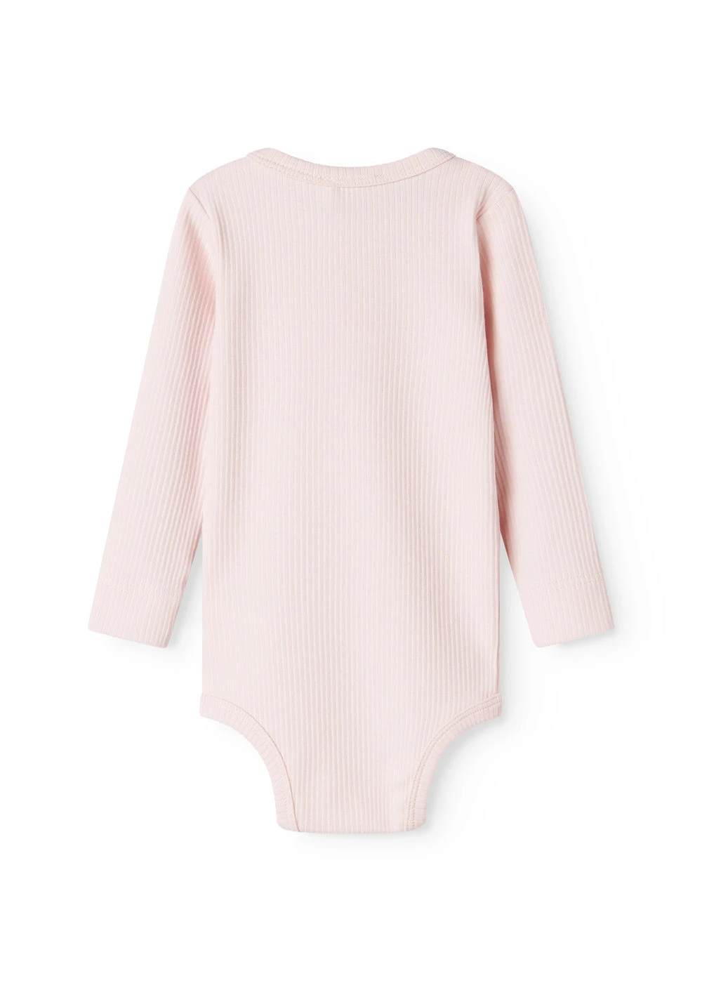 Long-sleeved baby modal bodystocking with placket button closure that is closed with snaps between the legs for easy diaper changes.