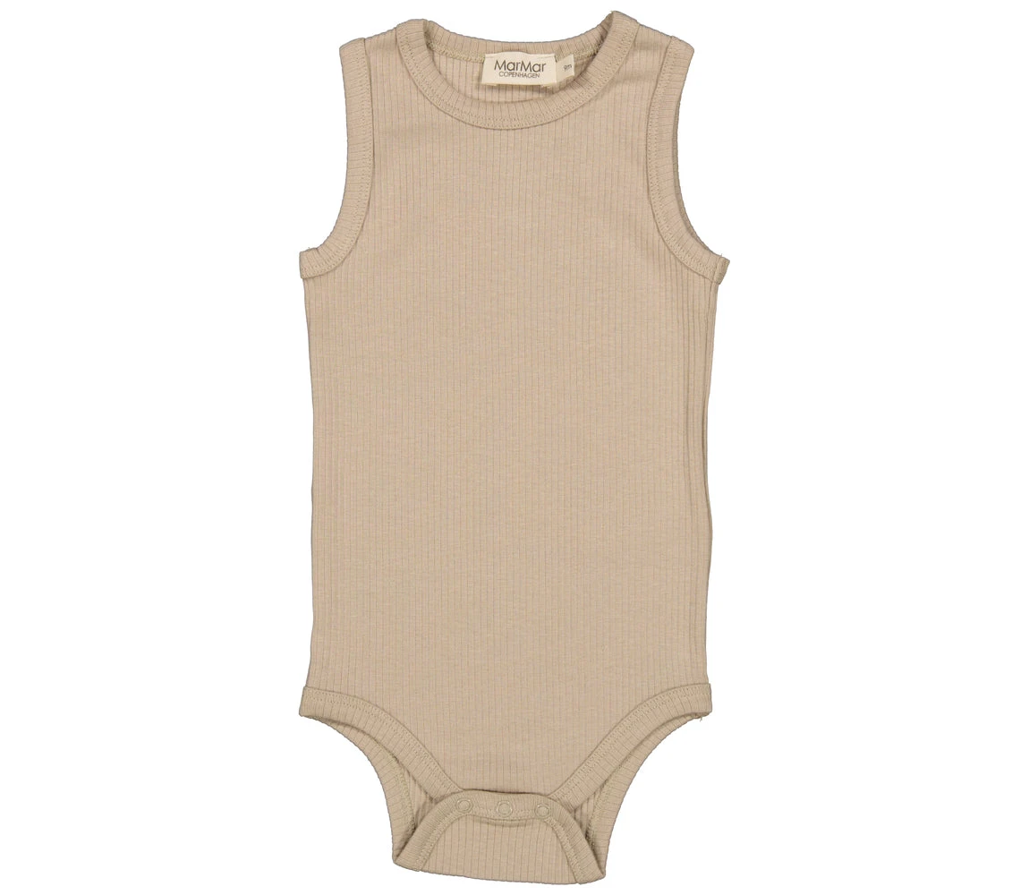 Sleeveless bodystocking that closes with snaps between the legs for easy diaper changes. The bodystocking is ribbed, soft, holds its shape and color and has elastane in it, which makes it stretchy and comfortable to wear.