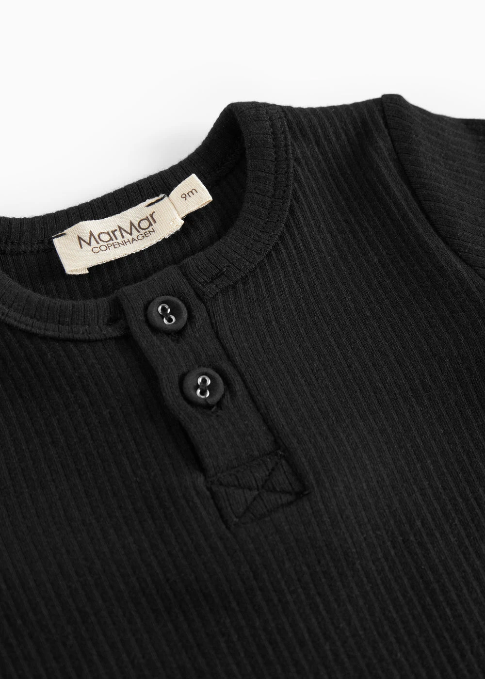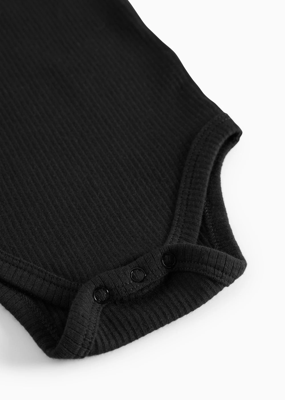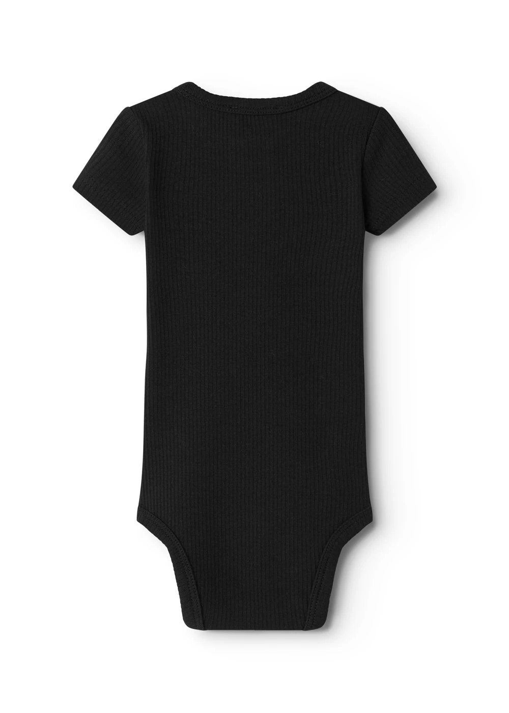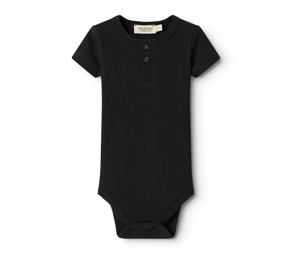 Short-sleeved baby modal bodystocking with placket button closure that is closed with snaps between the legs for easy diaper changes.