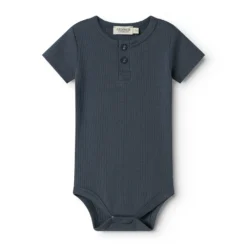 Short-sleeved baby modal bodystocking with placket button closure that is closed with snaps between the legs for easy diaper changes.