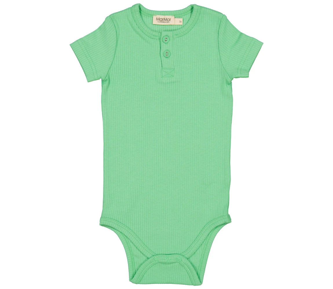 Short-sleeved baby modal bodystocking with placket button closure, which is closed with snaps between the legs for easy diaper changes. The bodystocking is ribbed, soft, holds shape and color and has elastane in it, which makes it stretchy and comfortable to wear.