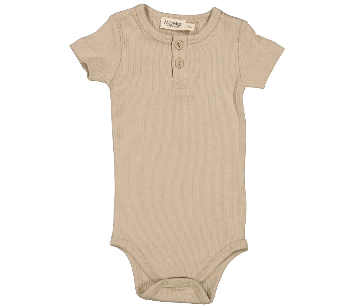 Short-sleeved baby modal bodystocking with placket button closure, which is closed with snaps between the legs for easy diaper changes. The bodystocking is ribbed, soft, holds shape and color and has elastane in it, which makes it stretchy and comfortable to wear.
