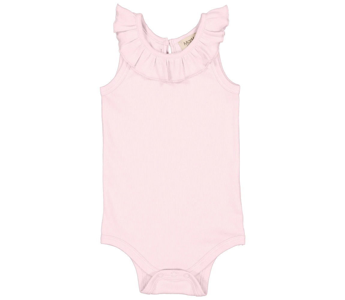 Sleeveless bodystocking with cute ruffle and button closure at the neck, the bodystocking closes between the legs for easy diaper changes. The bodystocking is soft, stretchy and comfortable to wear.