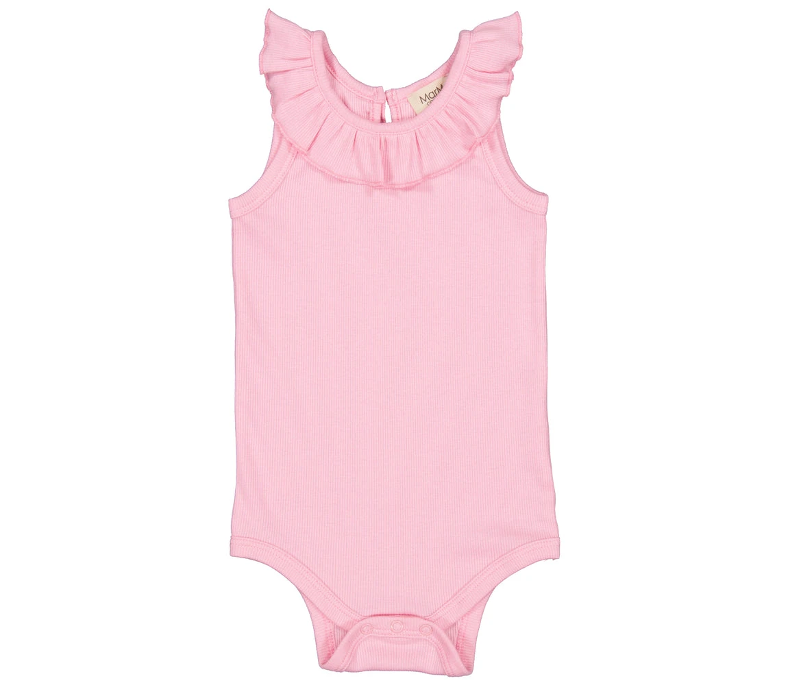 Sleeveless bodystocking with cute ruffle and button closure at the neck, the bodystocking closes between the legs for easy diaper changes. The bodystocking is soft, stretchy and comfortable to wear.