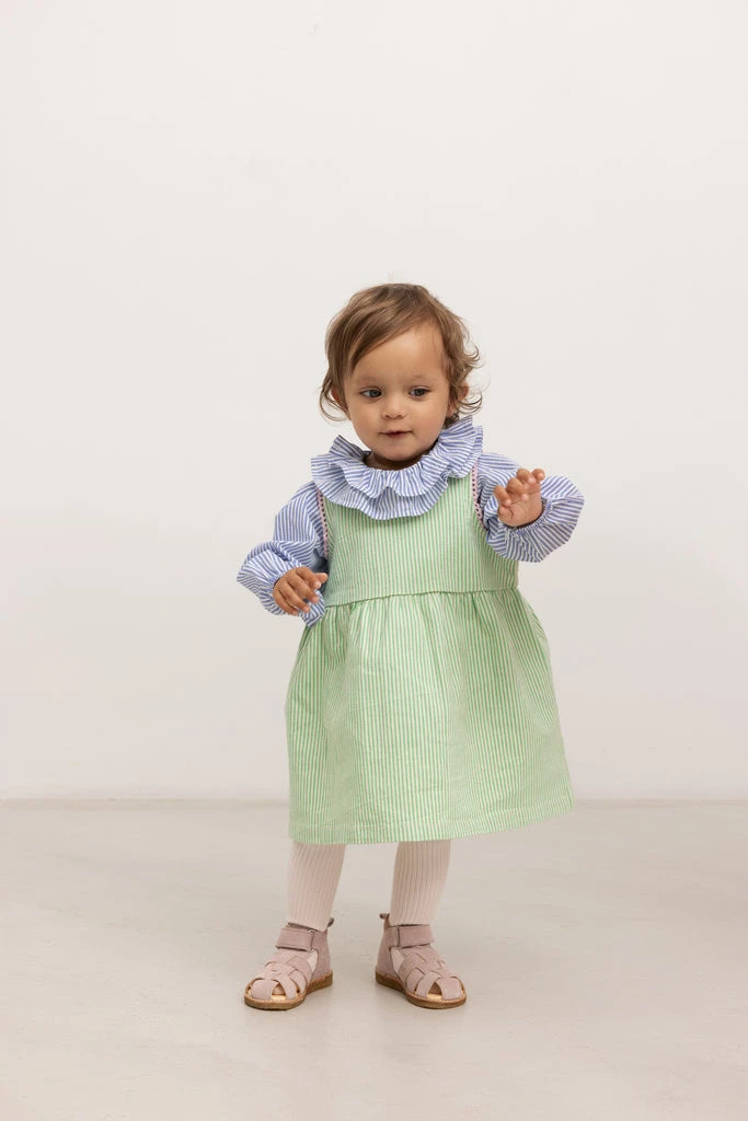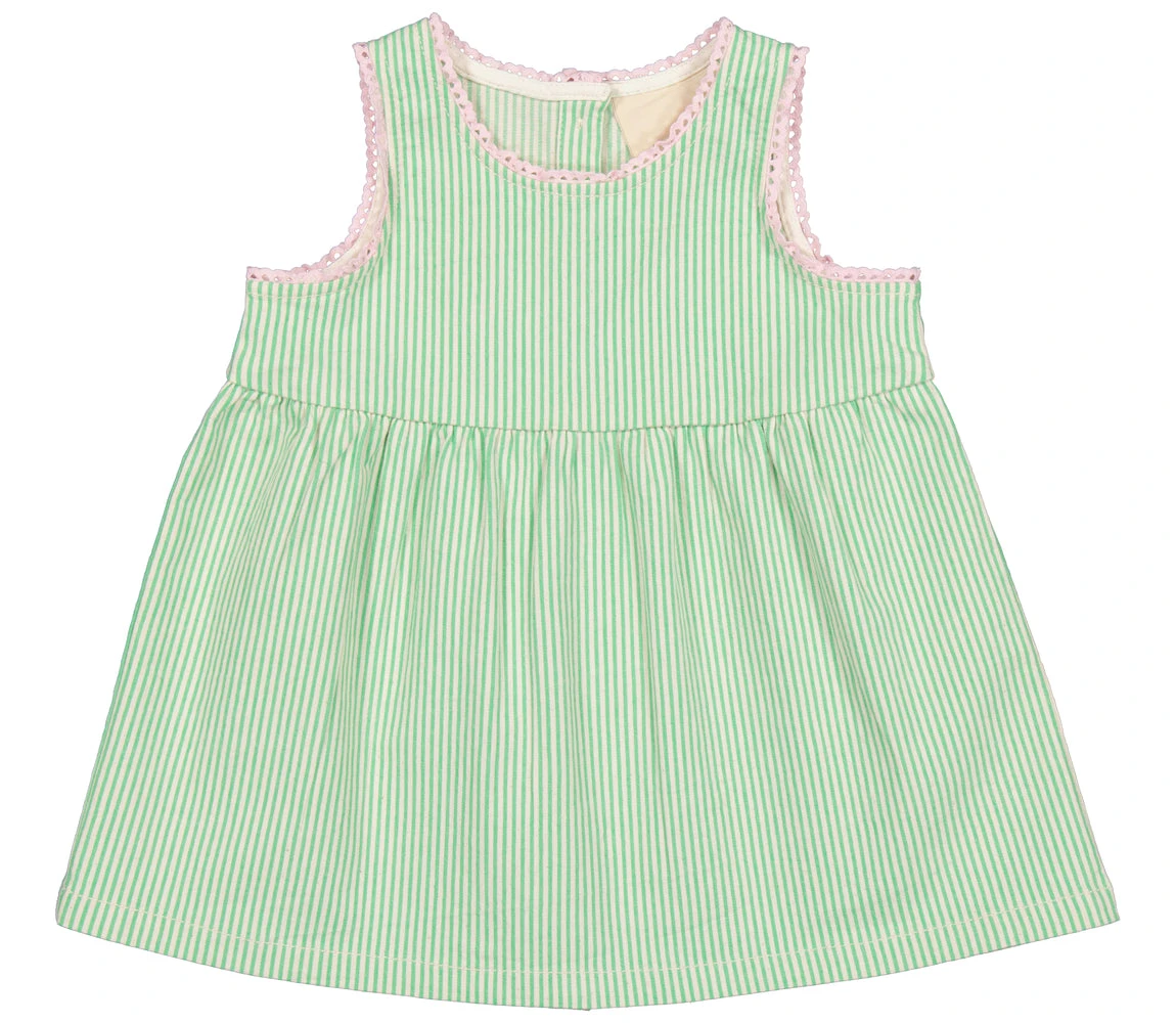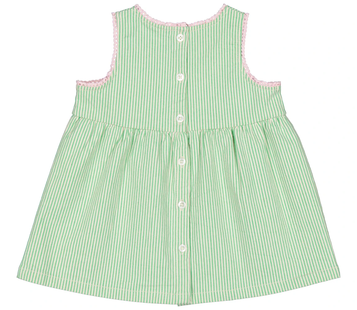 Dress with button closure at the back. The dress has fine contrasting picot edges. The length of the dress goes above the knee.