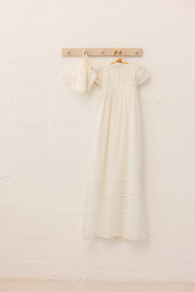 The dress is in the color Cloud, an antique white shade. This carefully chosen color gives the dress a vintage-inspired look, reminiscent of a christening gown passed down through generations.