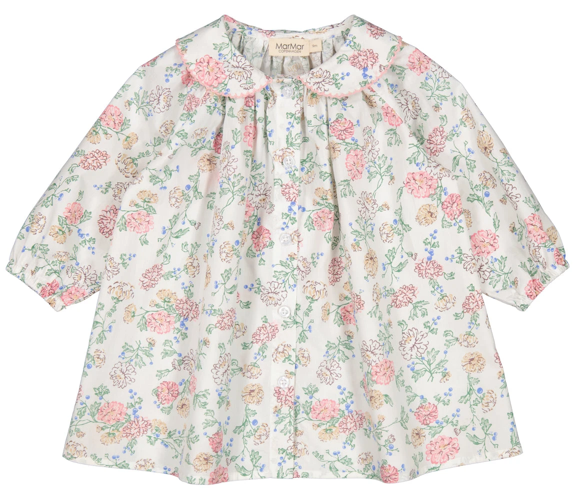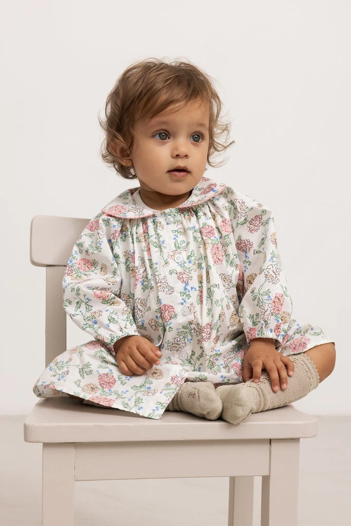 Long-sleeved dress in a loose fit with a small collar with picot edges and button closure at the front. The length of the dress goes above the knees. The dress has a light and crispy quality