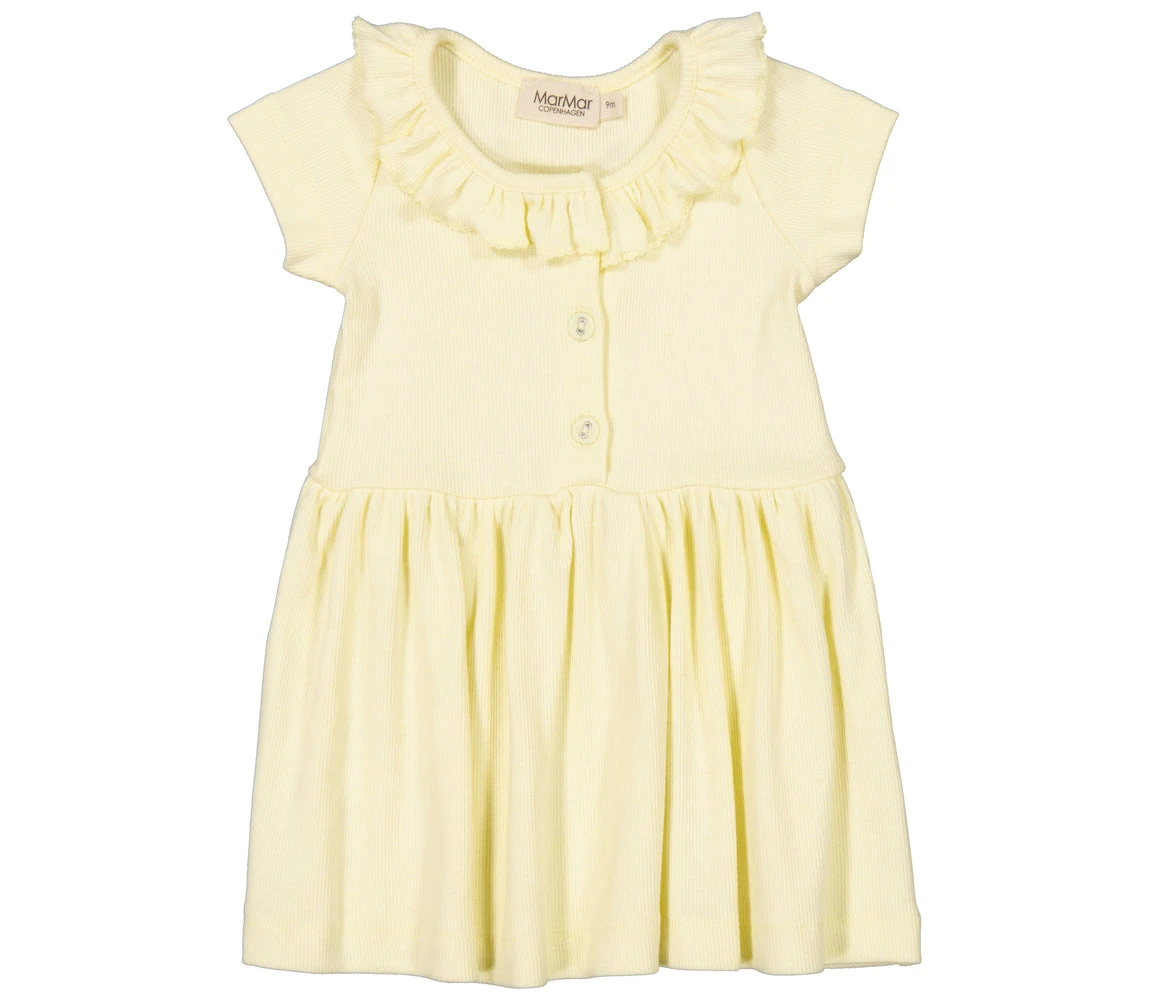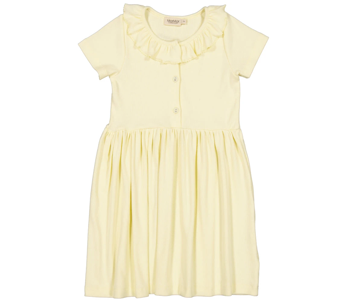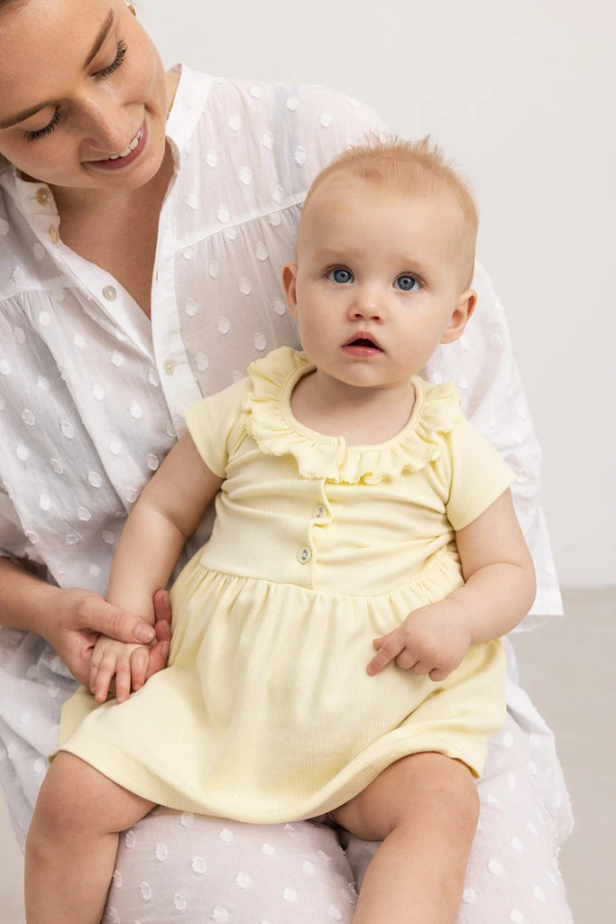 Short-sleeved dress with button closure and cute collar. The length of the dress goes above the knee. The dresses are both soft, stretchy and comfortable to wear.