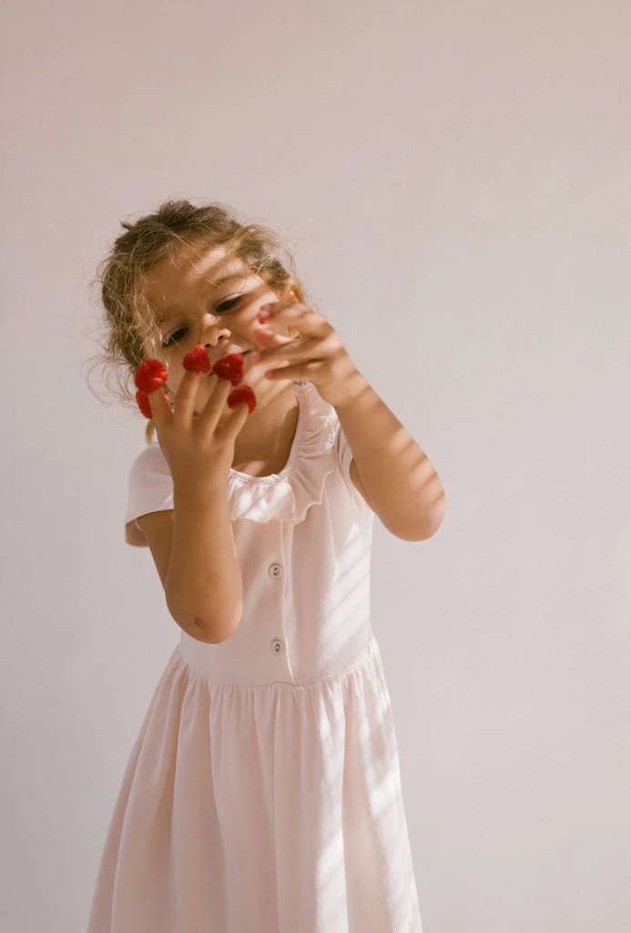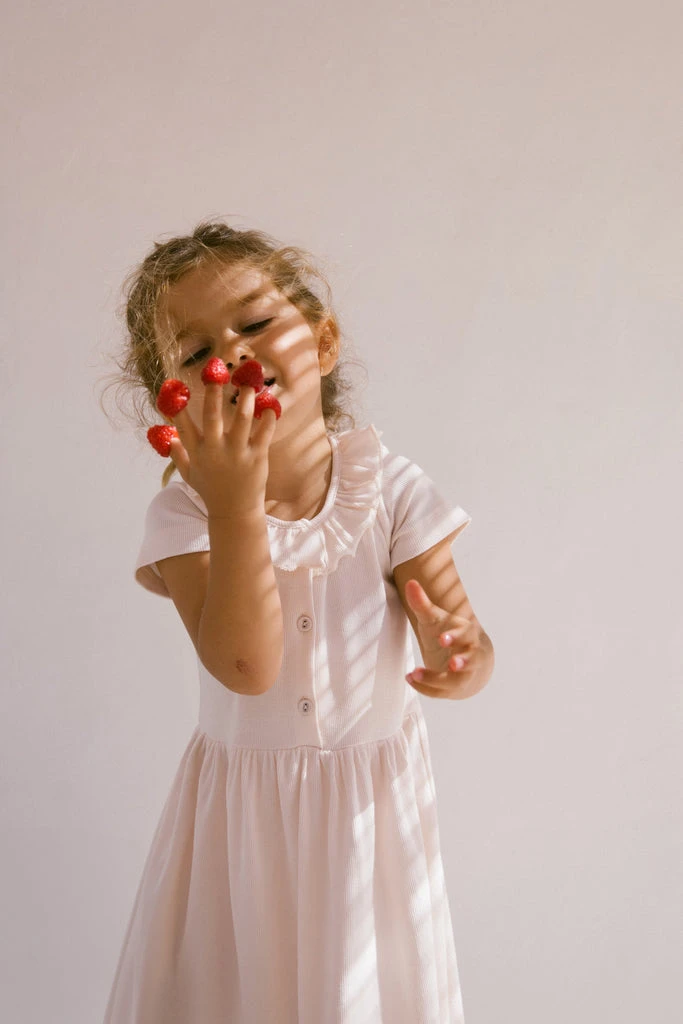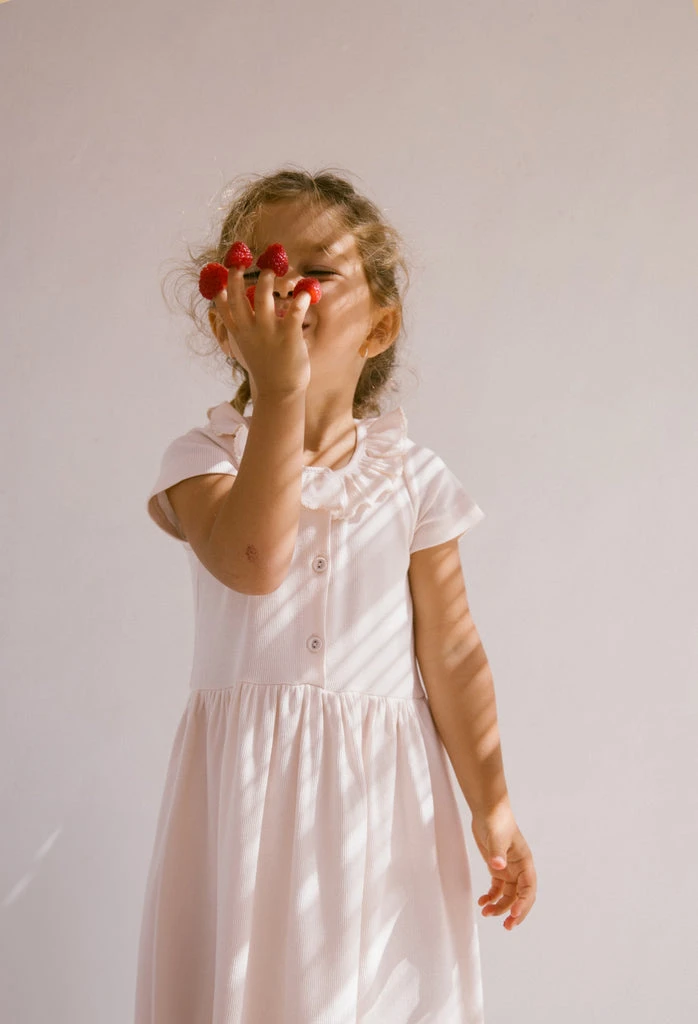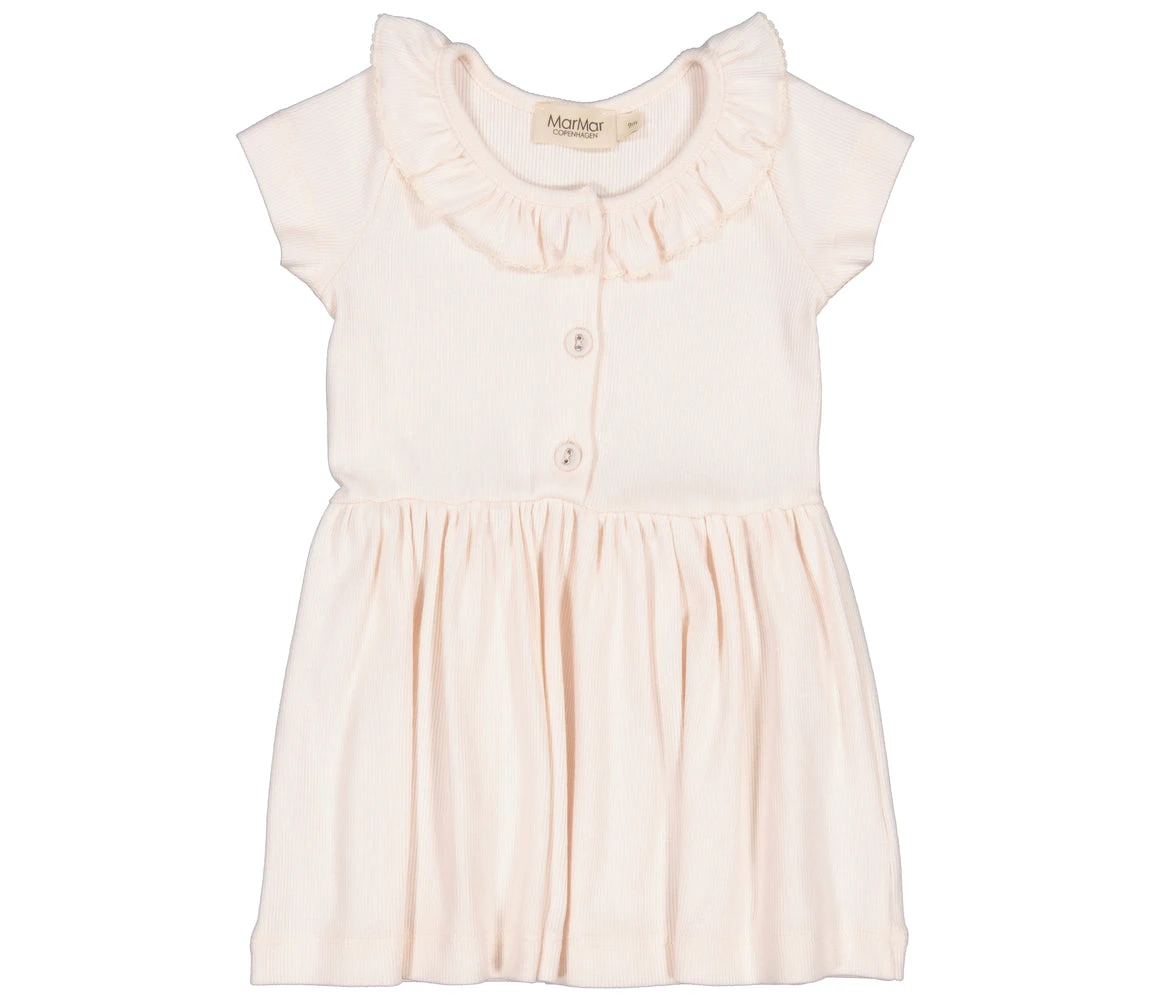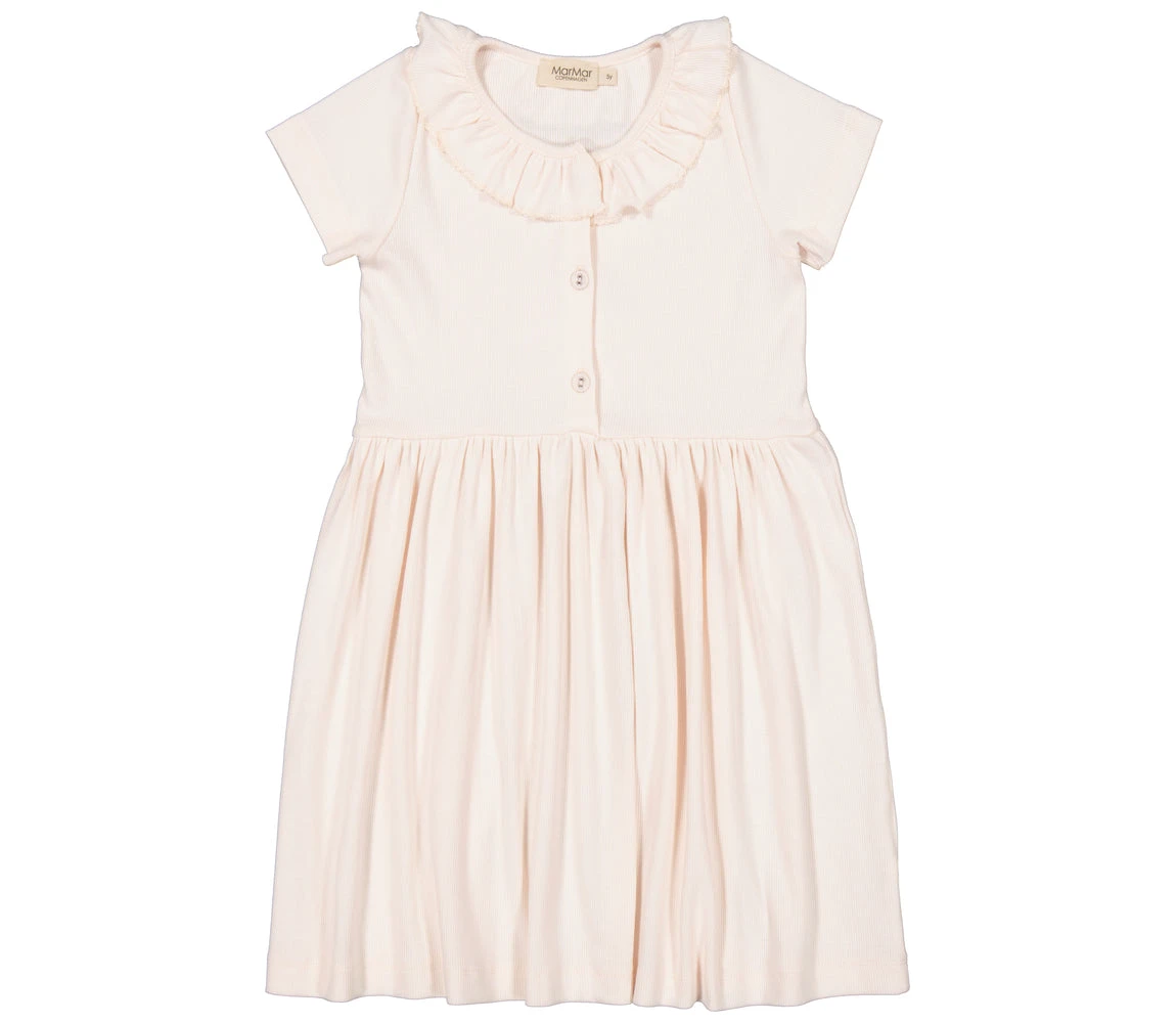 Short-sleeved dress with button closure and cute collar. The length of the dress goes above the knee. The dresses are both soft, stretchy and comfortable to wear.