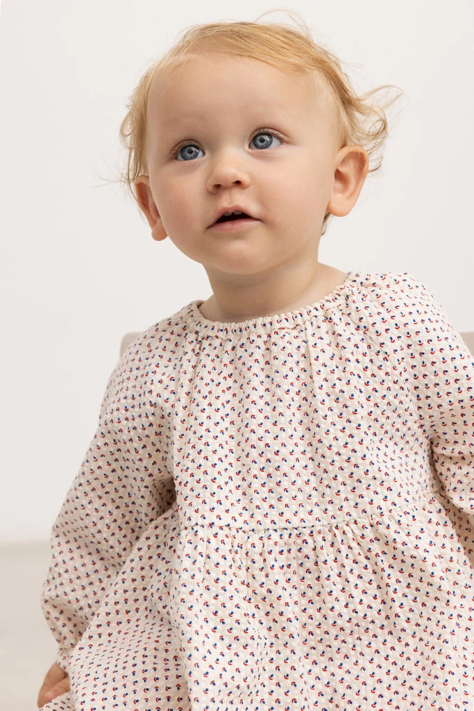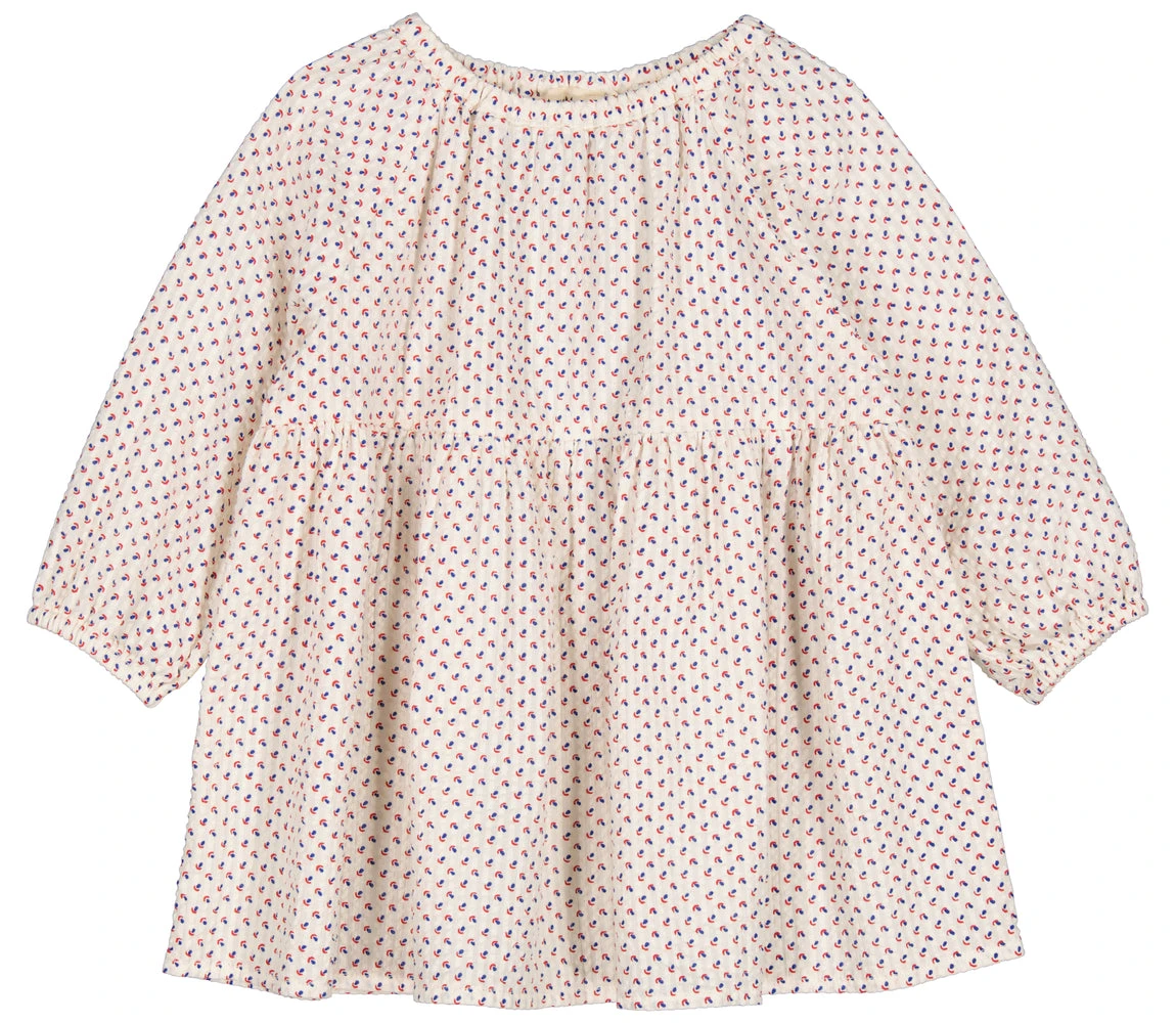 Long-sleeved baby brook and wave dress with a loose fit. The length of the dress goes to above the knee.