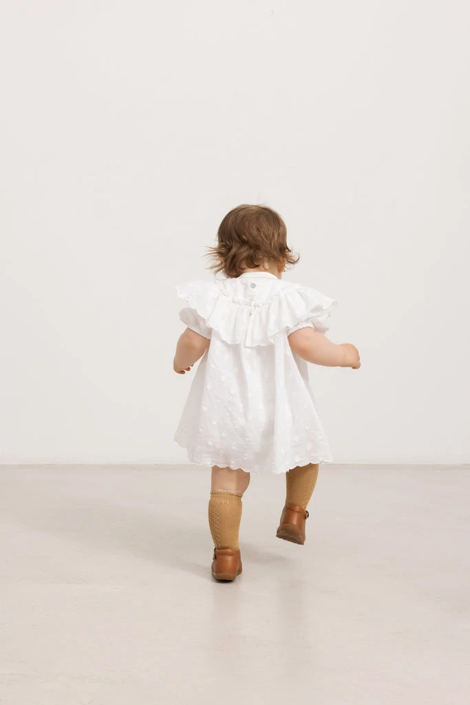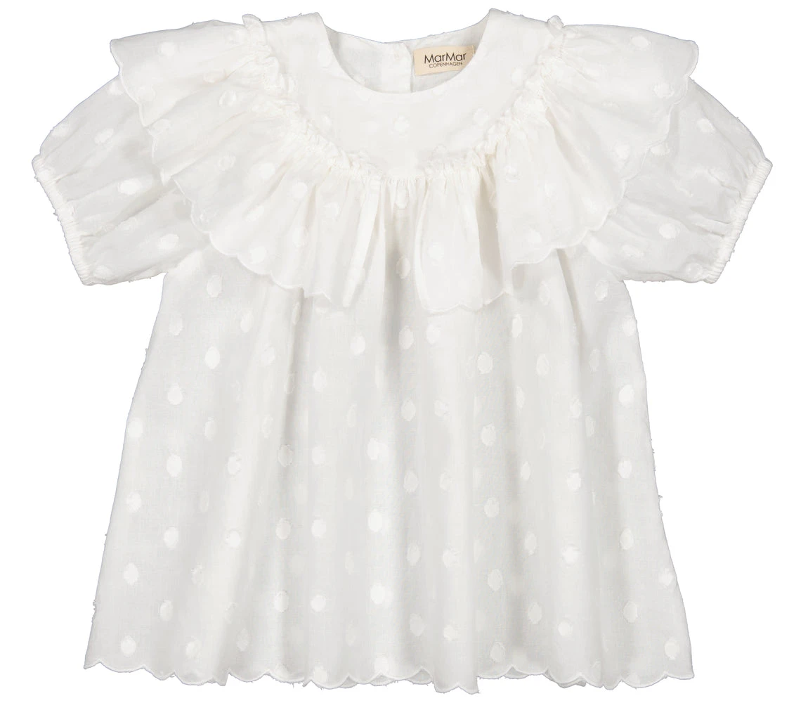 Comfortable short-sleeved dress for baby with a good fit. The dress has a nice collar at the front. The dress closes with buttons at the back and the length goes above the knees.