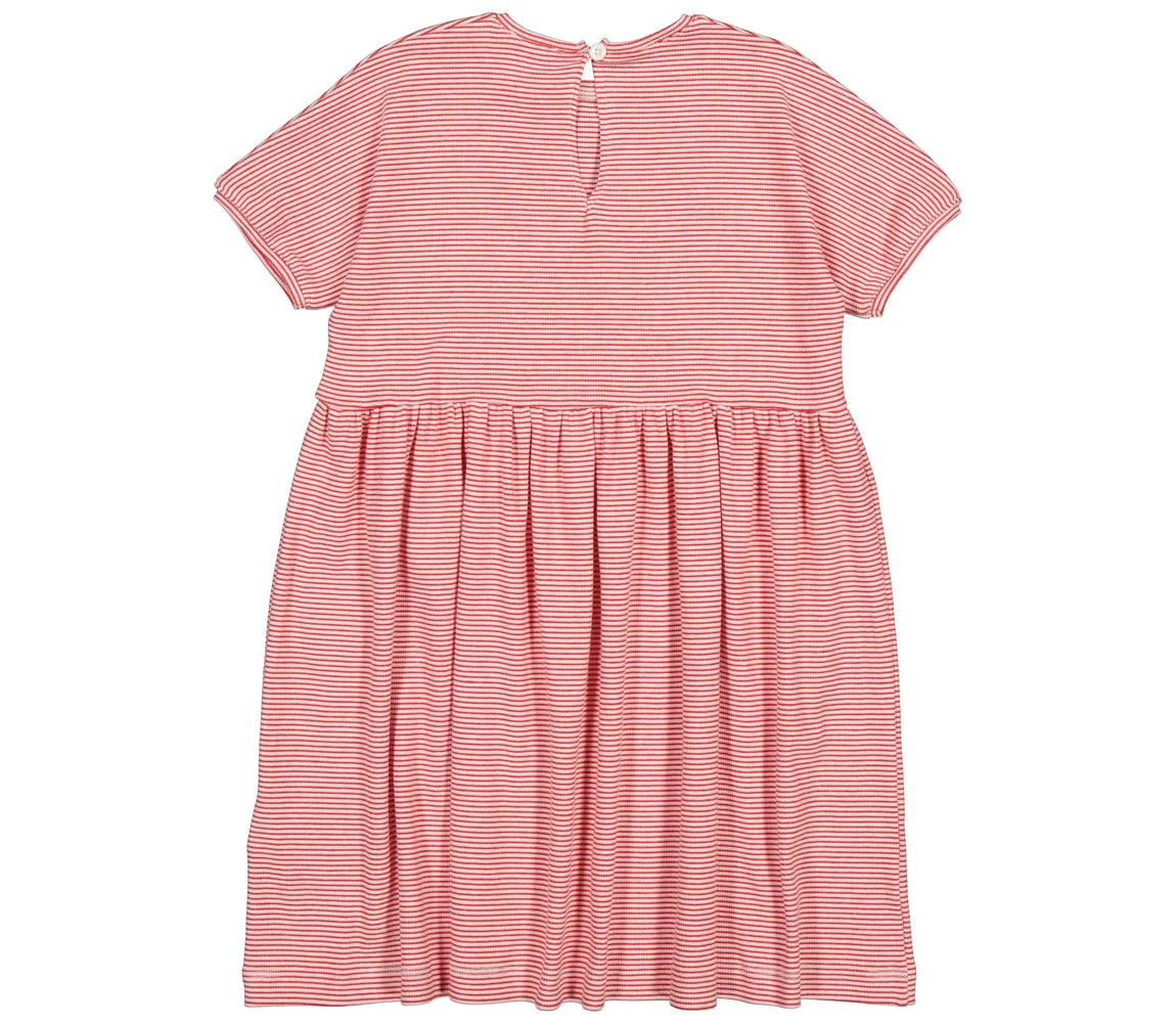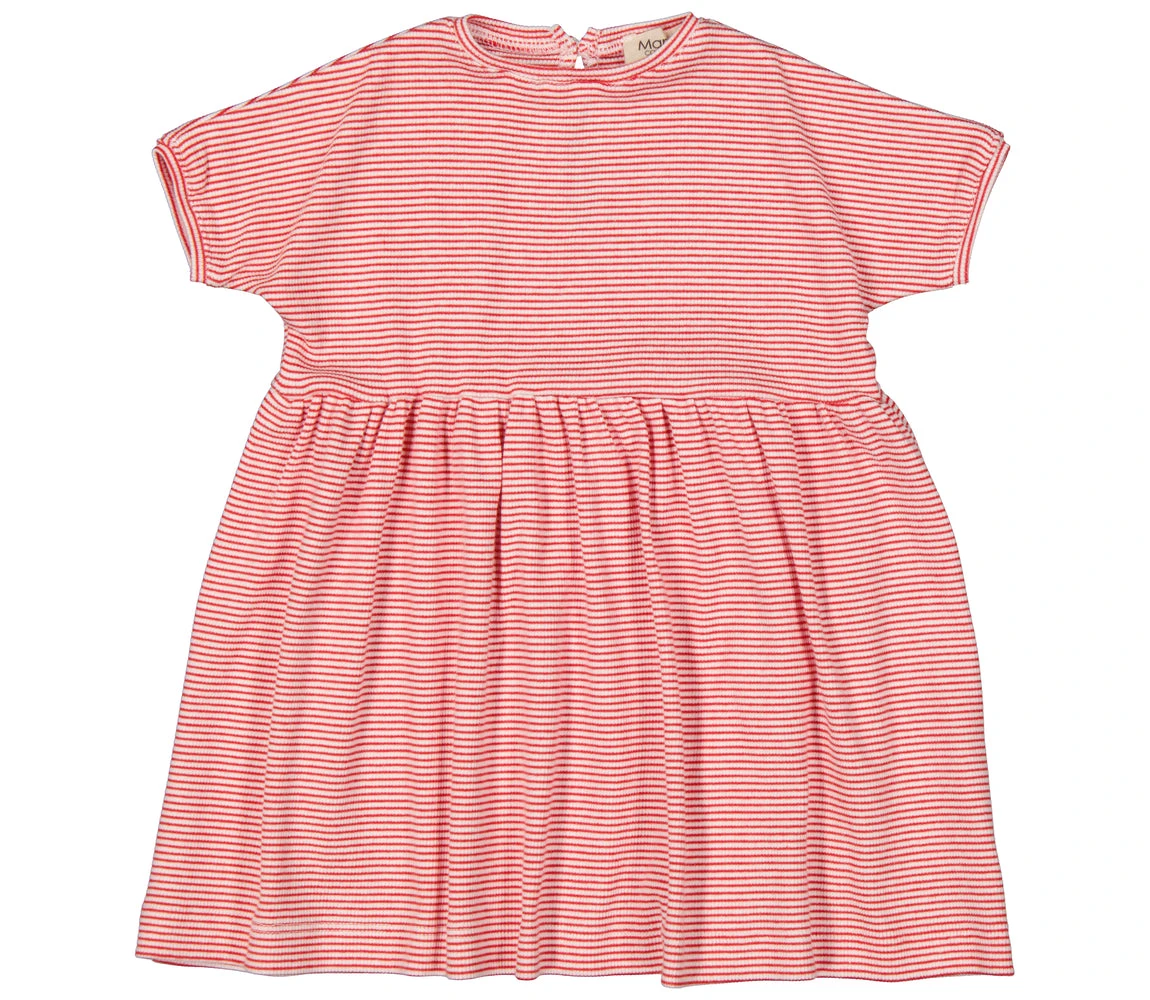 Short-sleeved dress with fine stripes and a beautiful skirt. The dress has a button closure at the back and the length of the dress goes above the knee. The dress is both soft, stretchy and comfortable to wear.