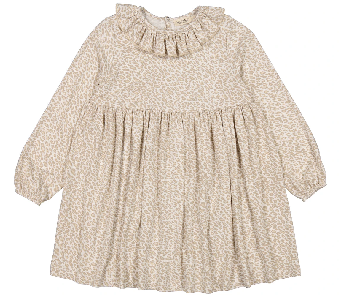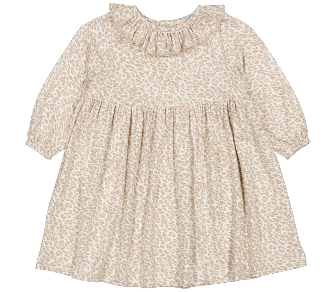 Dress with leopard print in a loose fit with a small ruffle at the neckline. The dress has a peplum and a button closure at the back. The length of the dress goes above the knee. The dress is both very soft, stretchy and comfortable to wear