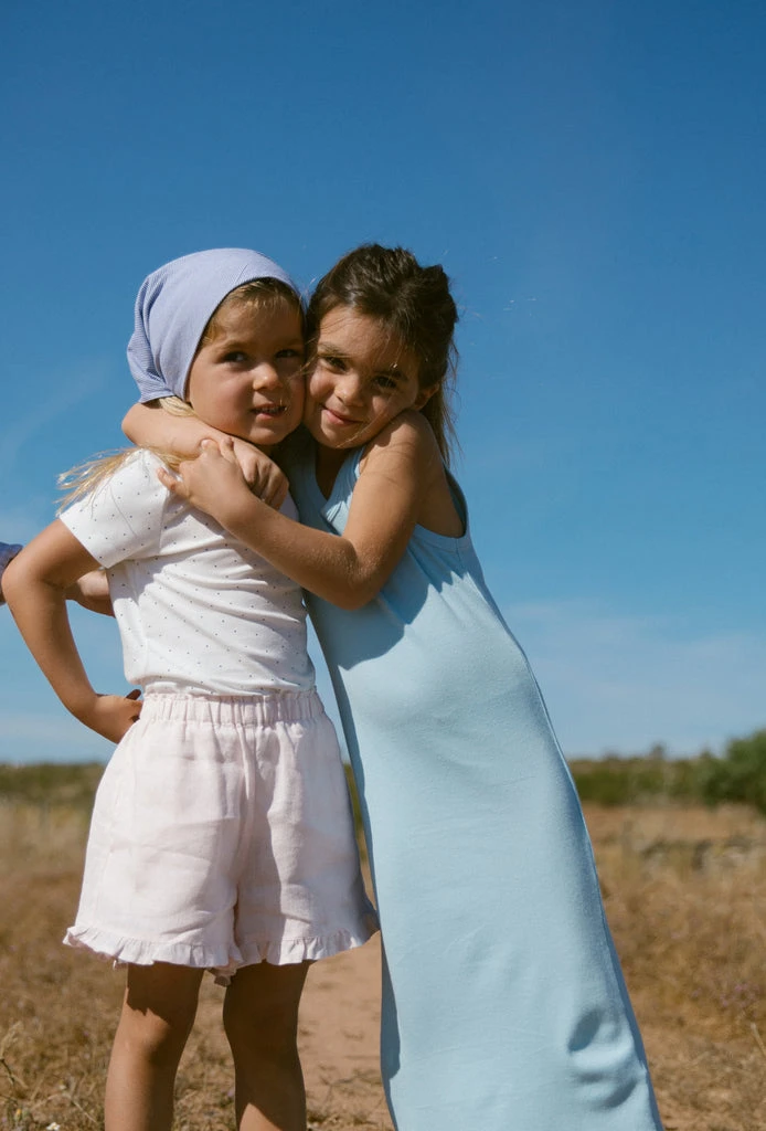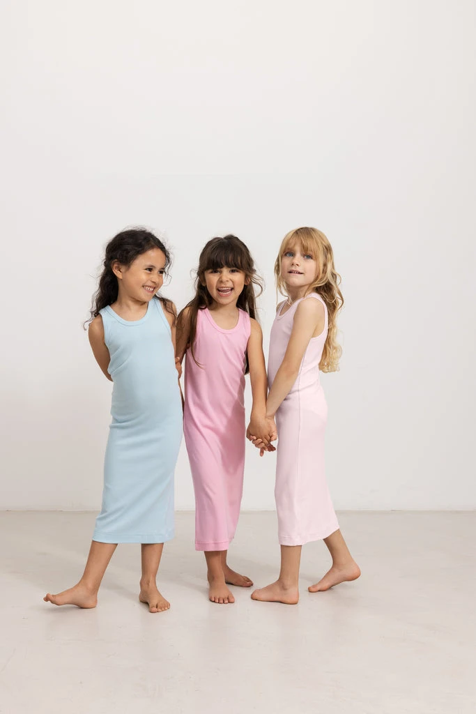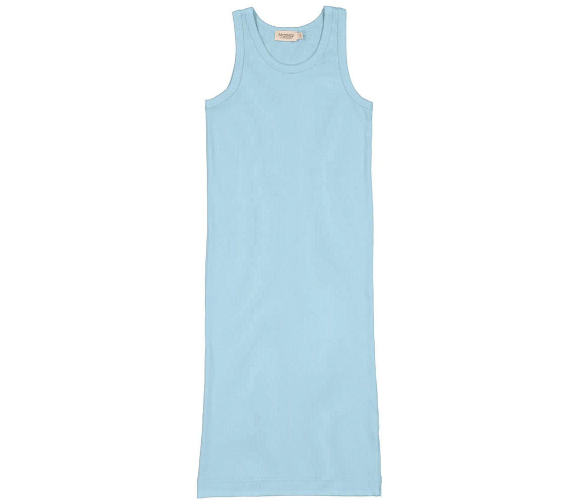 Long and comfortable sleeveless dress. The length of the dress goes below the knee. The dress is both soft, stretchy and comfortable to wear.