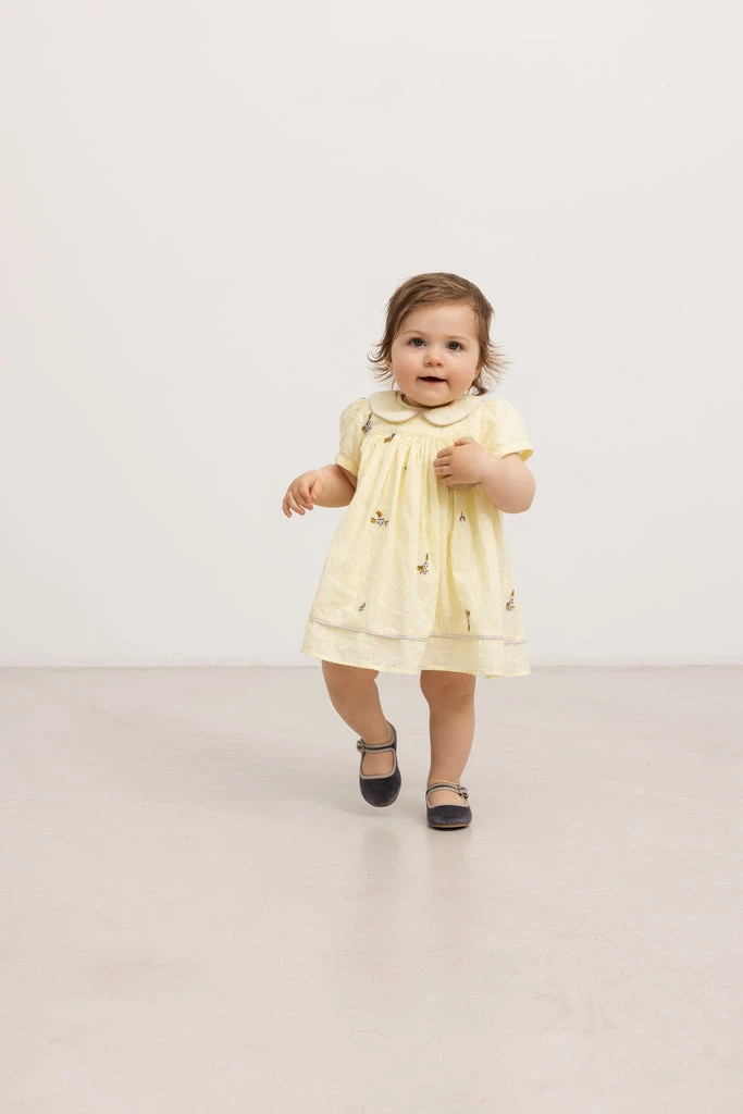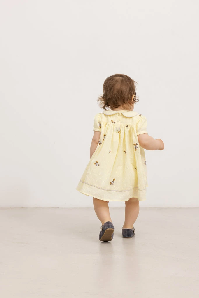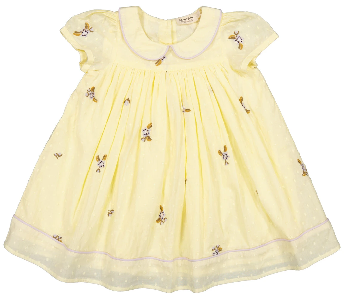 Comfortable short-sleeved dress with a nice embroidery pattern, good fit, cute collar and closes with buttons on the back. The length of the dress goes above the knee.