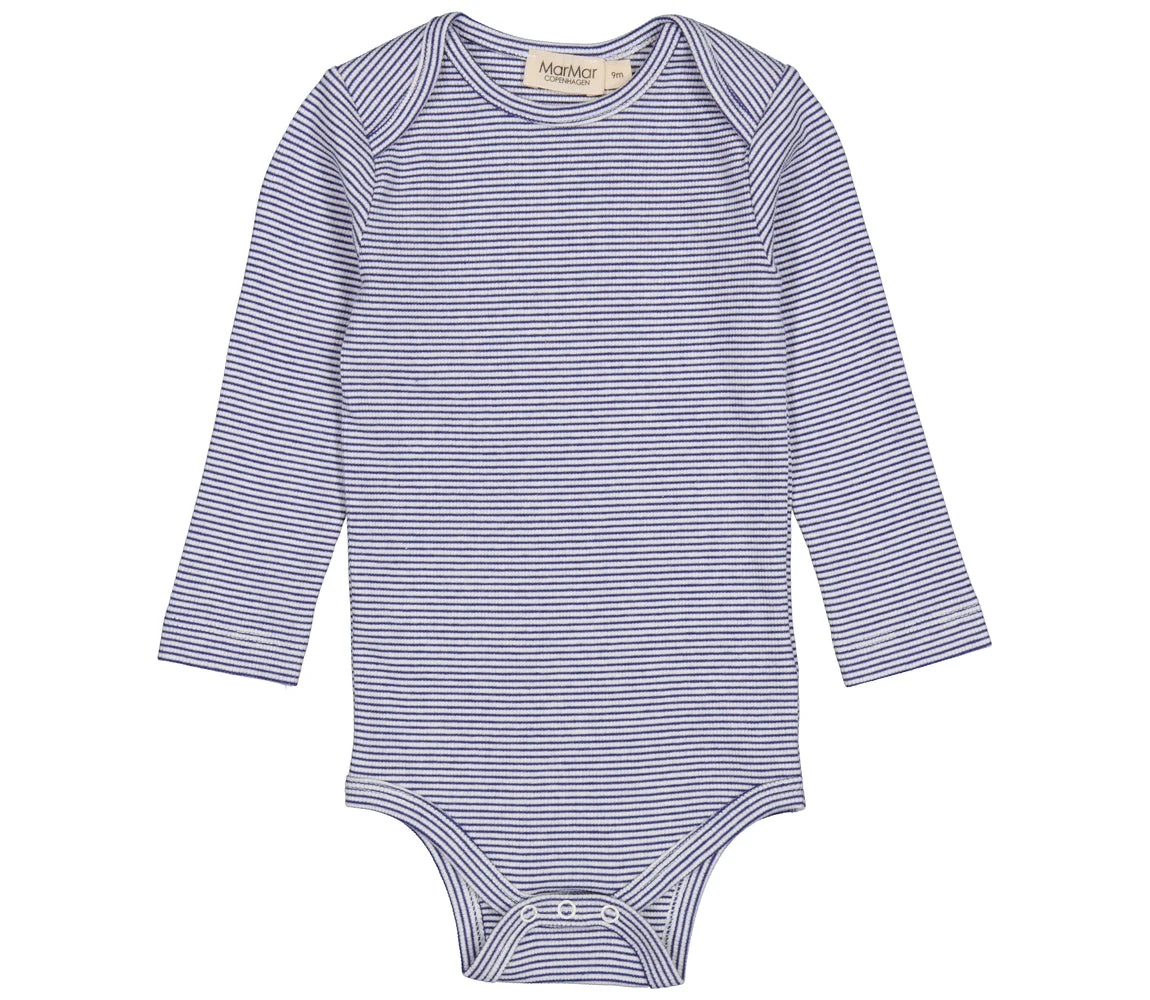 Long-sleeved bodystocking with fine stripes, smart neck opening without buttons that can be easily pulled down the body. The bodystocking closes with press studs between the legs for easy diaper changes. The bodystocking is both soft, stretchy and comfortable to wear