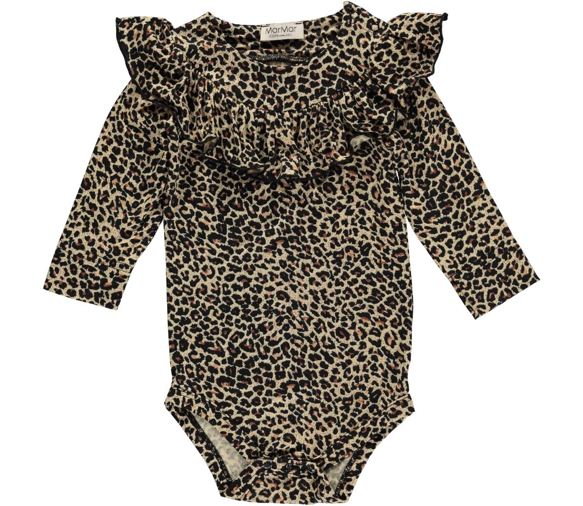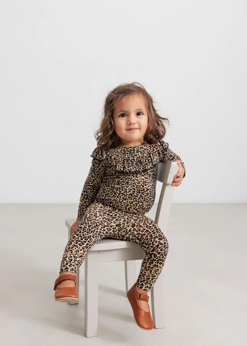 Long-sleeved leopard bodystocking with a ruffle collar, closed with snaps on the left shoulder and between the legs for easy diaper changes.