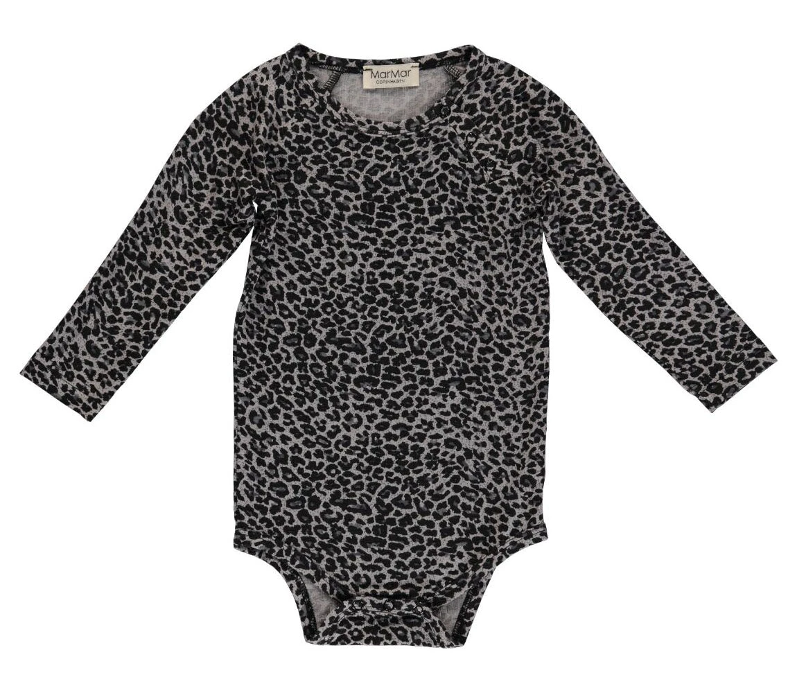 Simple long-sleeved leopard bodystocking that closes with snaps on the left shoulder and between the legs for easy diaper changes.