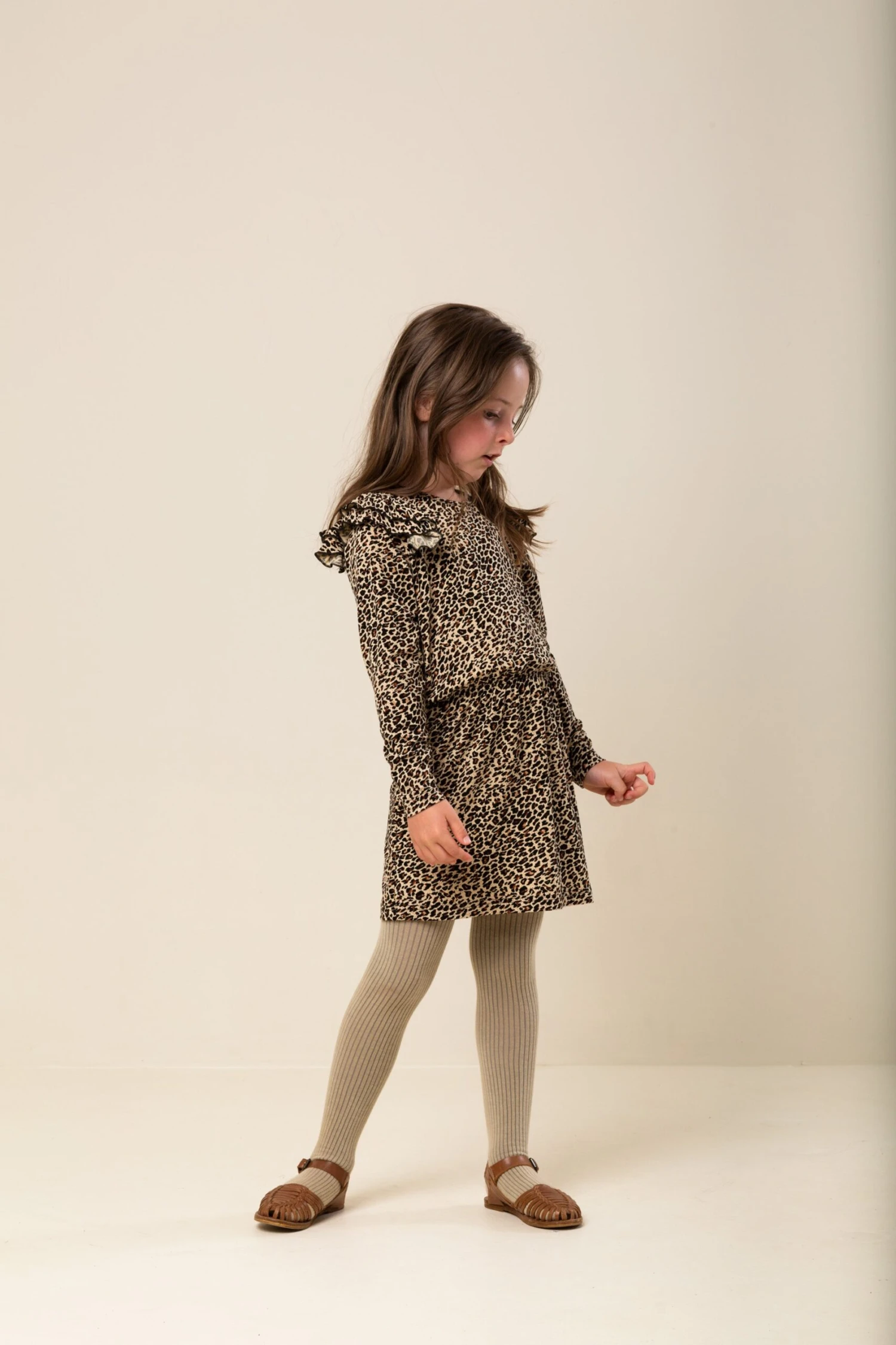 Dress with ruffles on the shoulder, elastic waist and long sleeves. The length of the dress goes above the knee.