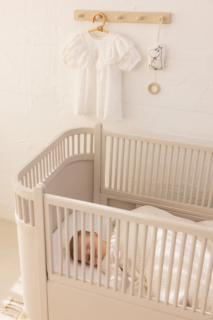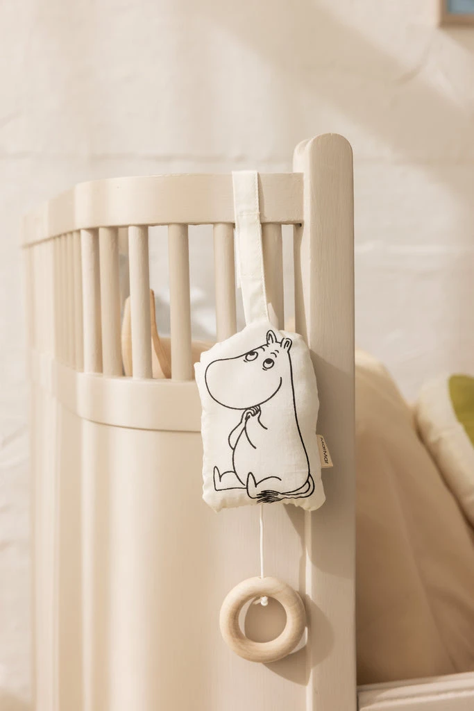 Musical alarm clock with Moomin print and wooden ring that plays Brahm’s Lullaby for your child when you pull the string