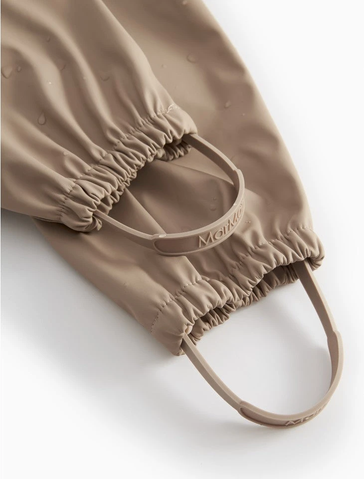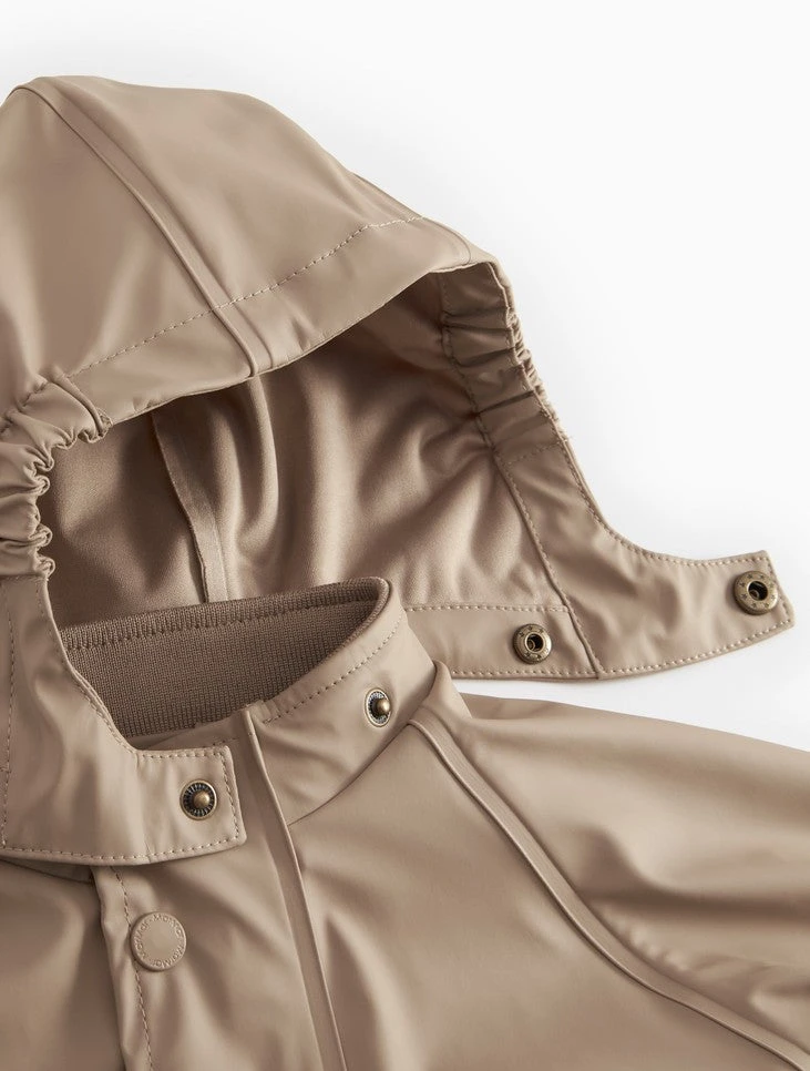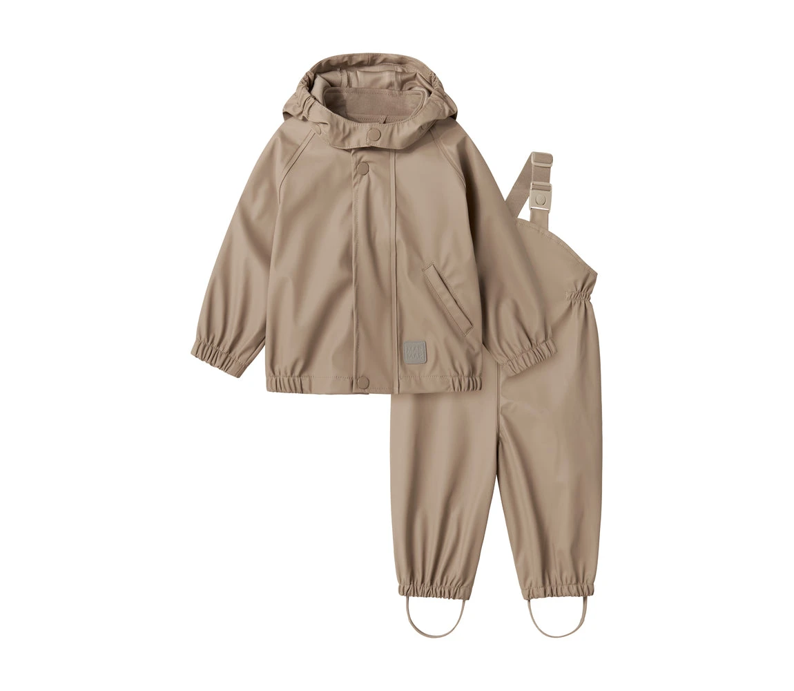 Rain set for the little ones. The rain pants have adjustable suspenders and elastic at the sides to ensure the best fit. The jacket has a pocket at the front, a removable hood and closes with a zipper and press studs at the front.