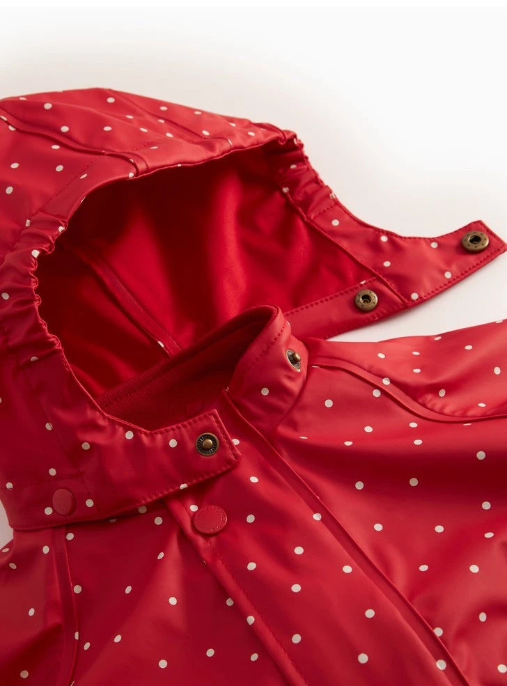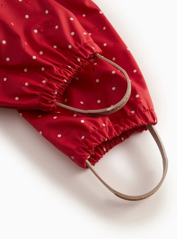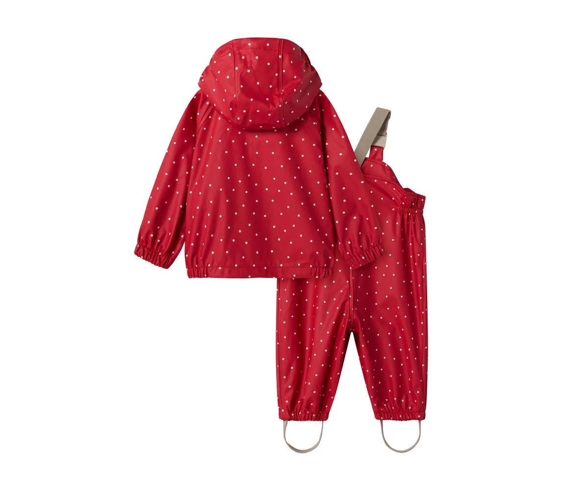 Rain set for the little ones. The rain pants have adjustable suspenders and elastic at the sides to ensure the best fit. The jacket has a pocket at the front, a removable hood and closes with a zipper and press studs at the front.