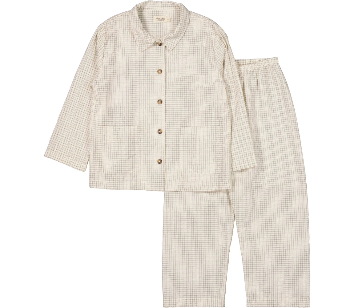 Pajama set with shirt and pants in a loose fit. The shirt has button closure and two pockets at the front and the pants have elastic at the waist.