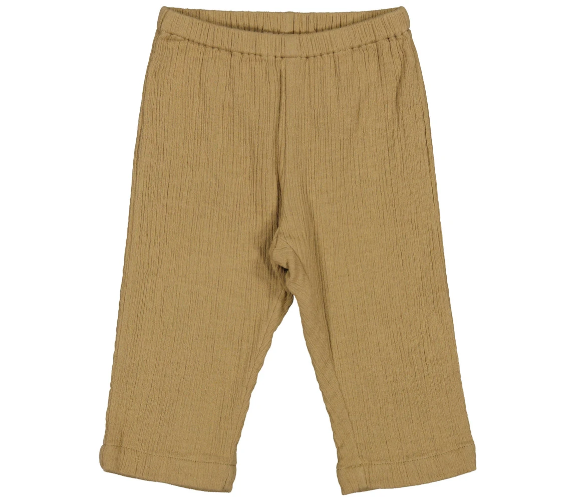 Comfortable pants with a loose fit and a pocket on the back and elastic waist. The pants are made of soft crepe cotton that makes them comfortable to wear.
