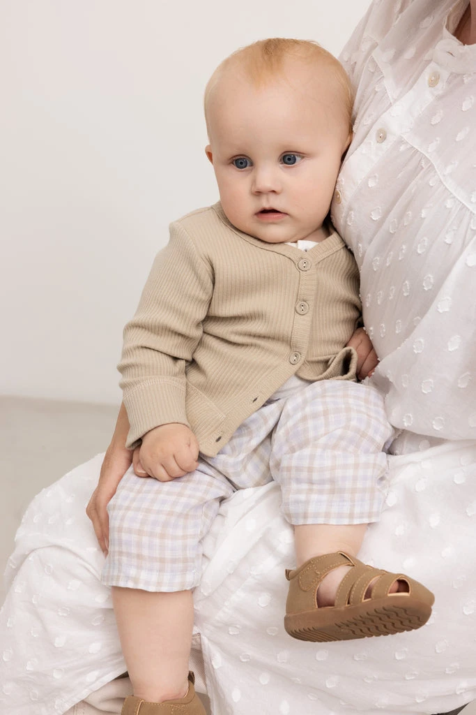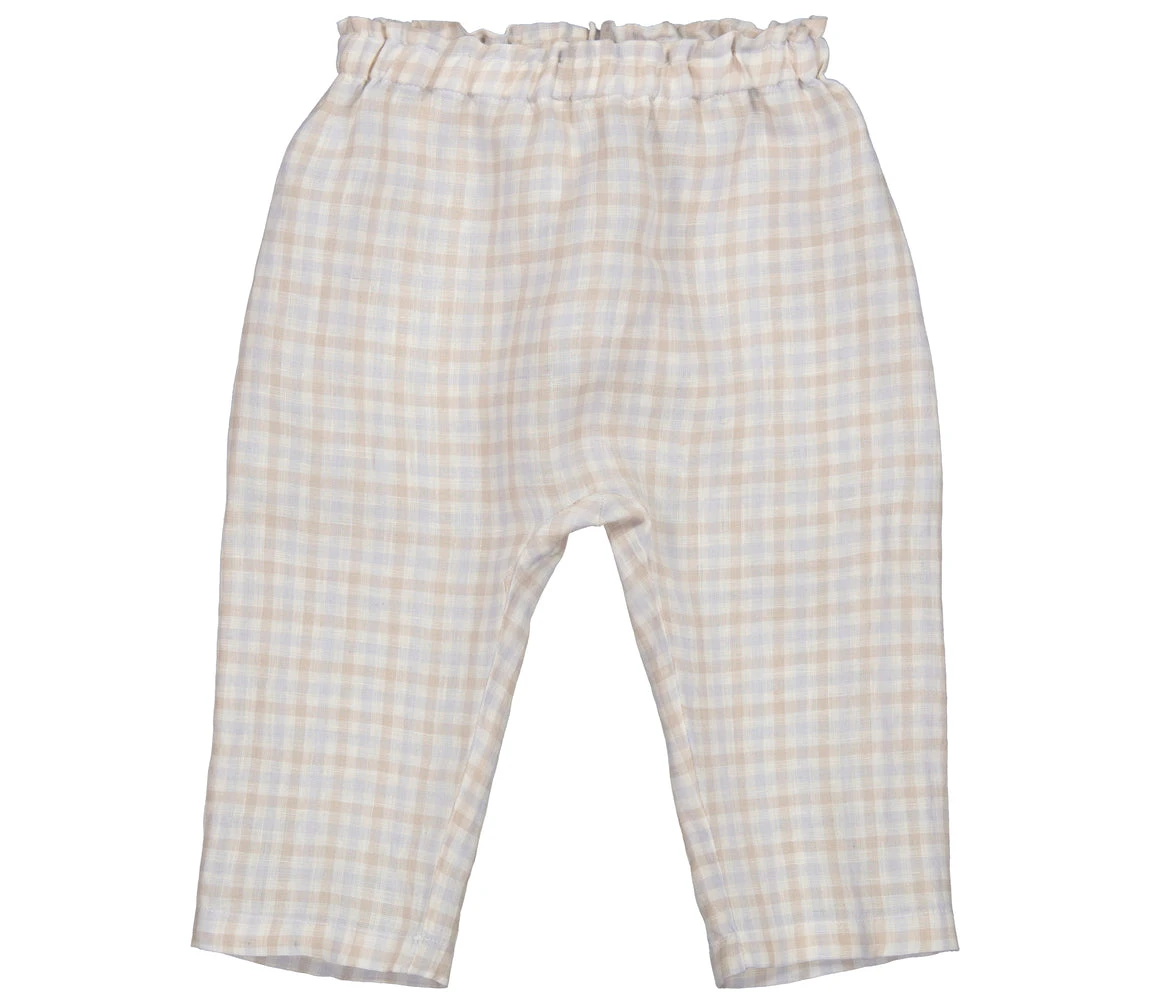 Comfortable linen trousers, woven in a check pattern and with a loose fit. The trousers have an elasticated waist.