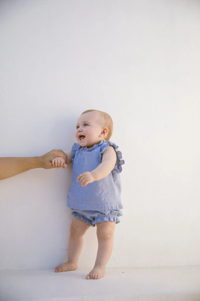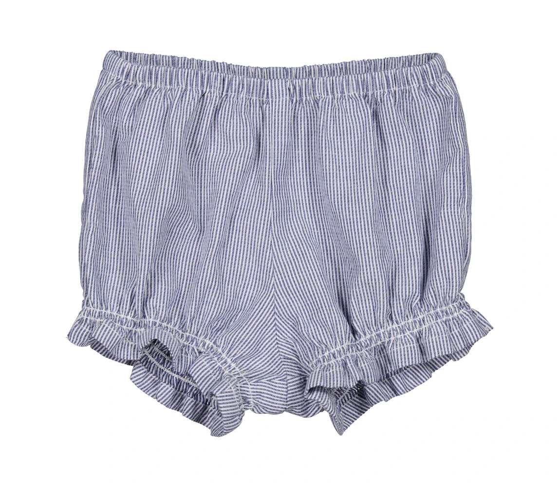 Bloomers with woven stripes, elastic waist, plenty of room for the diaper and fine wavy edge details