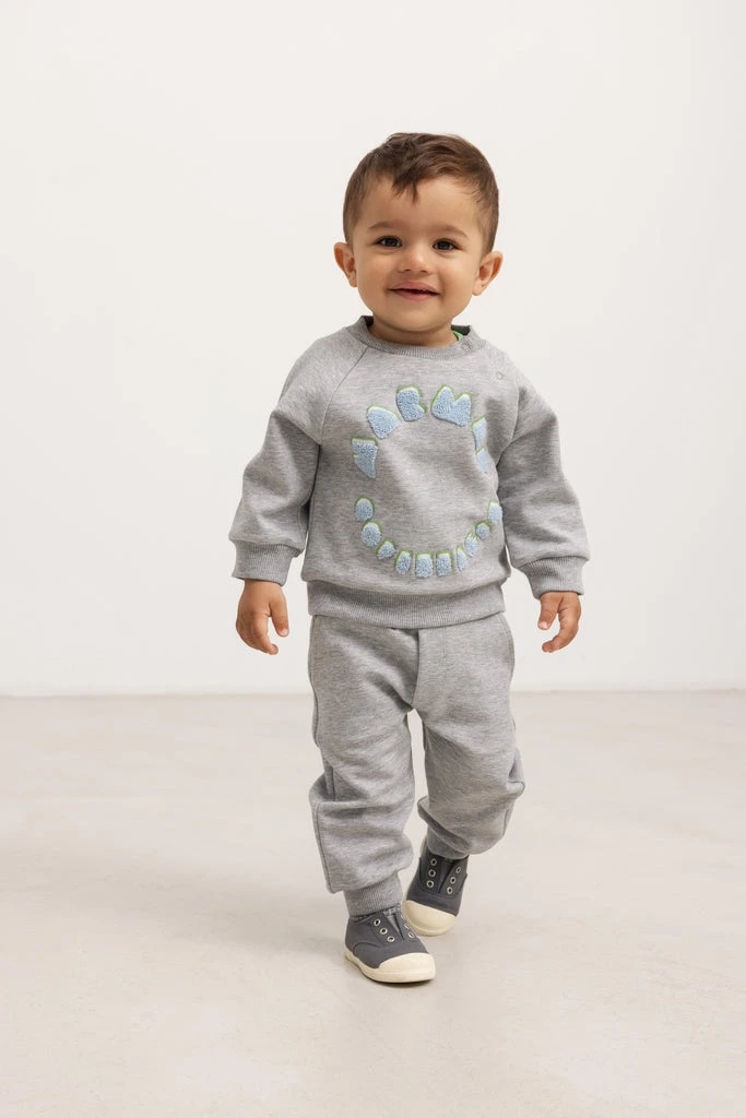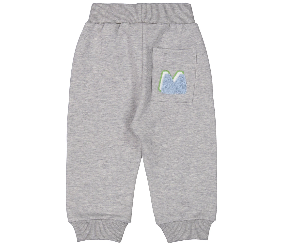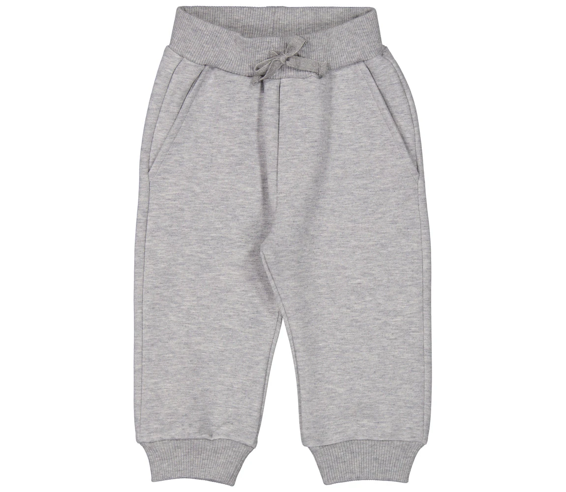 Baby sweatpants in a looser fit with elastic and ties as well as two side pockets and one back pocket. The sweatpants have a nice logo print, a soft brushed inside, are stretchy and comfortable to wear