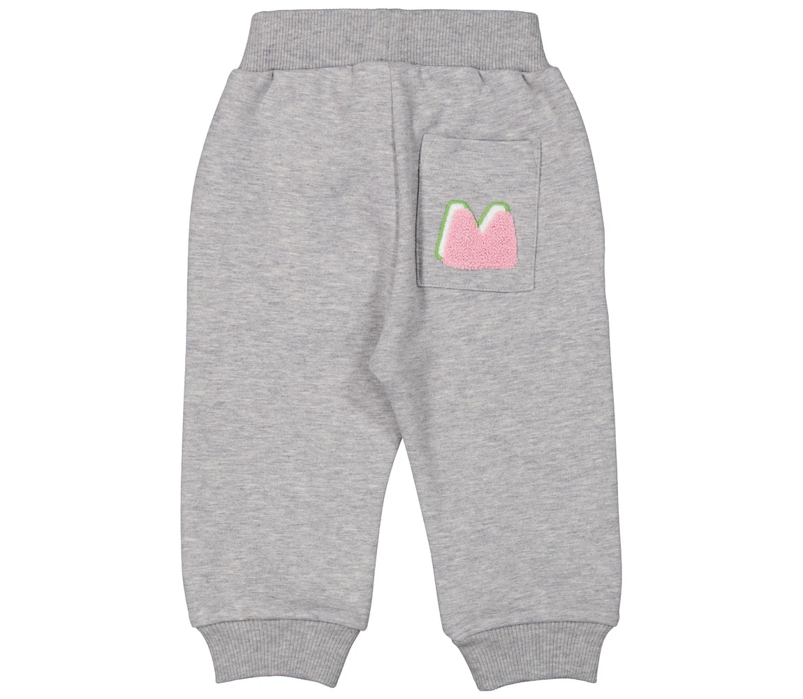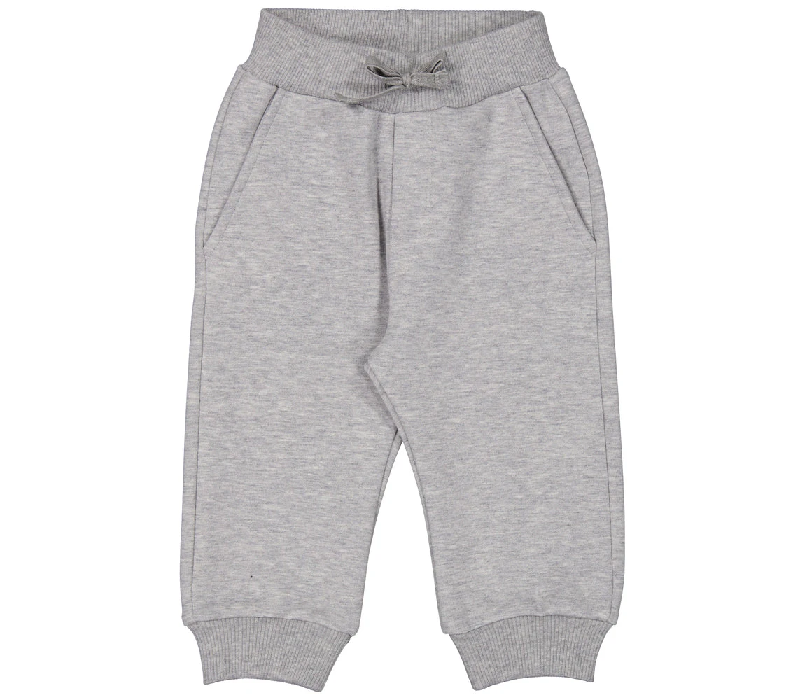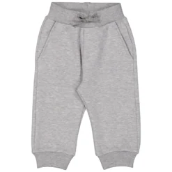 Baby sweatpants in a looser fit with elastic and ties as well as two side pockets and one back pocket. The sweatpants have a nice logo print, a soft brushed inside, are stretchy and comfortable to wear