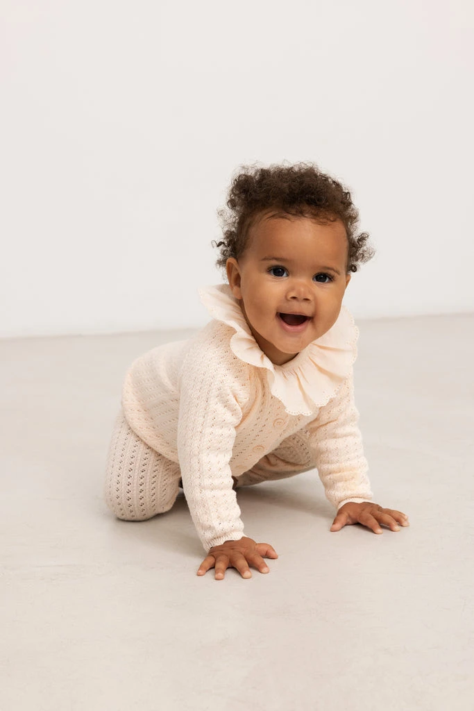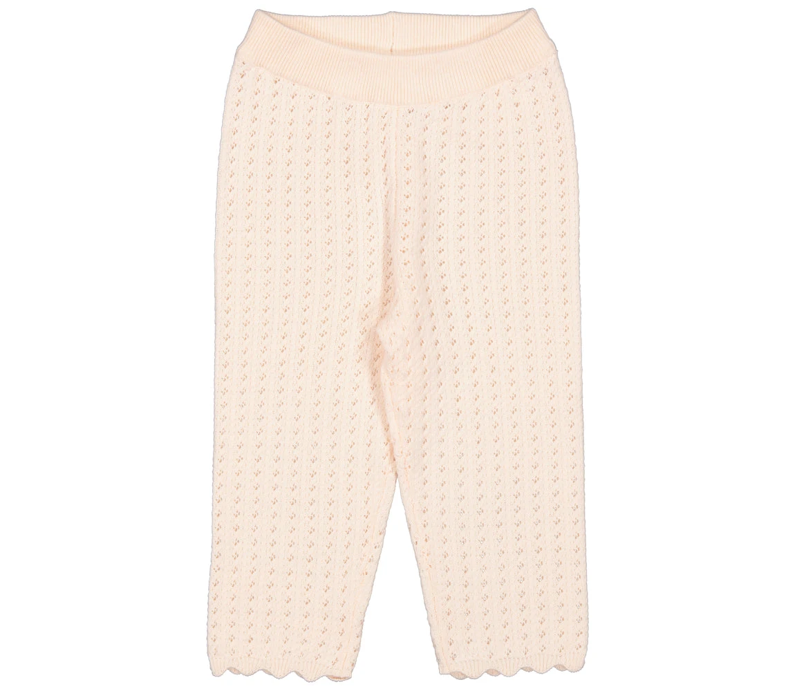 Knit trousers with elastic waist, wavy details at the bottom and fine pointelle details