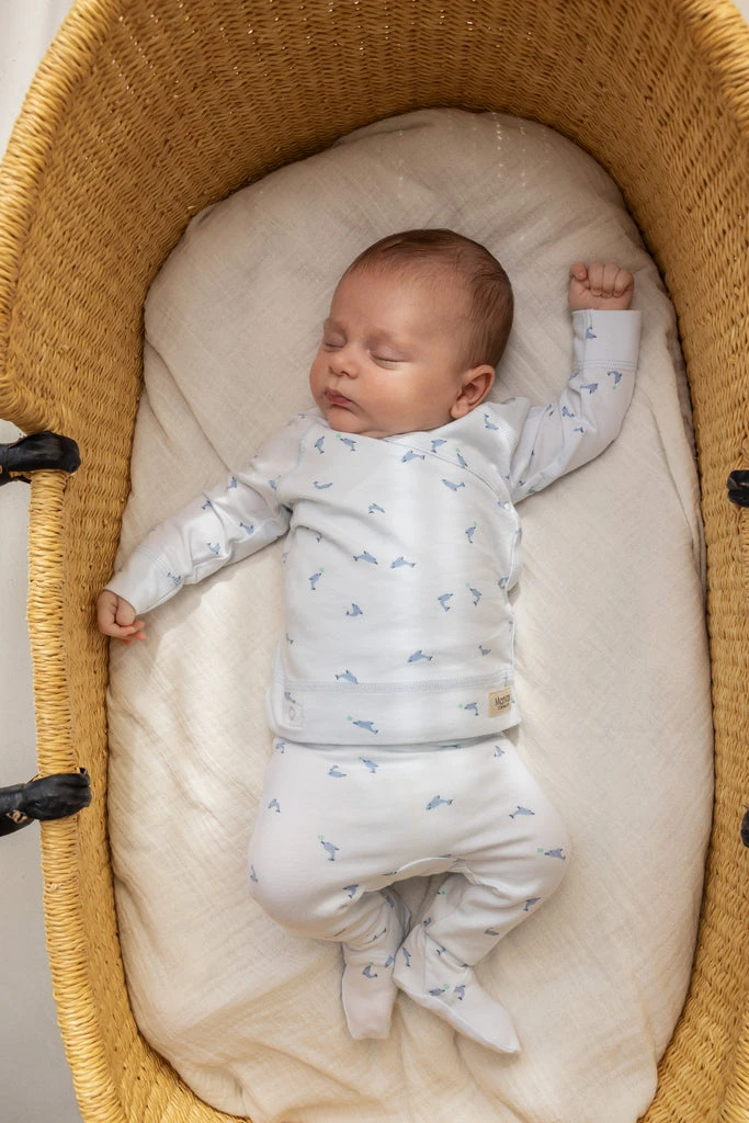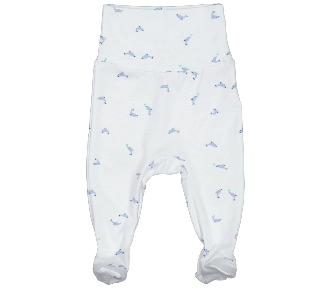Comfortable pants with feet for newborns with a cute dolphin print. The pants are soft, stretchy and comfortable to wear.