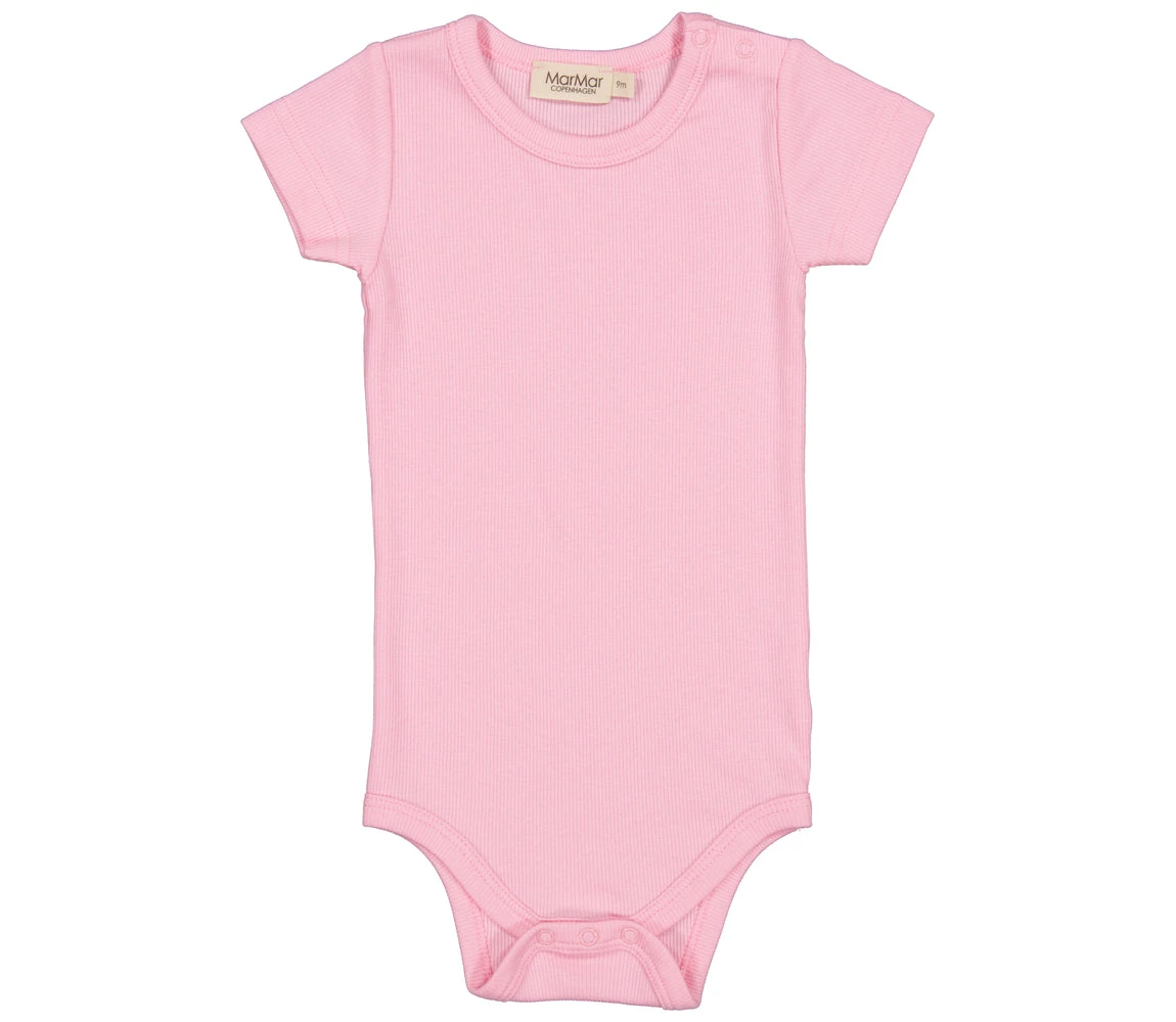 Simple short-sleeved bodystocking that closes with snaps on the left shoulder and between the legs for easy diaper changes. The bodystocking is soft, stretchy and comfortable to wear.