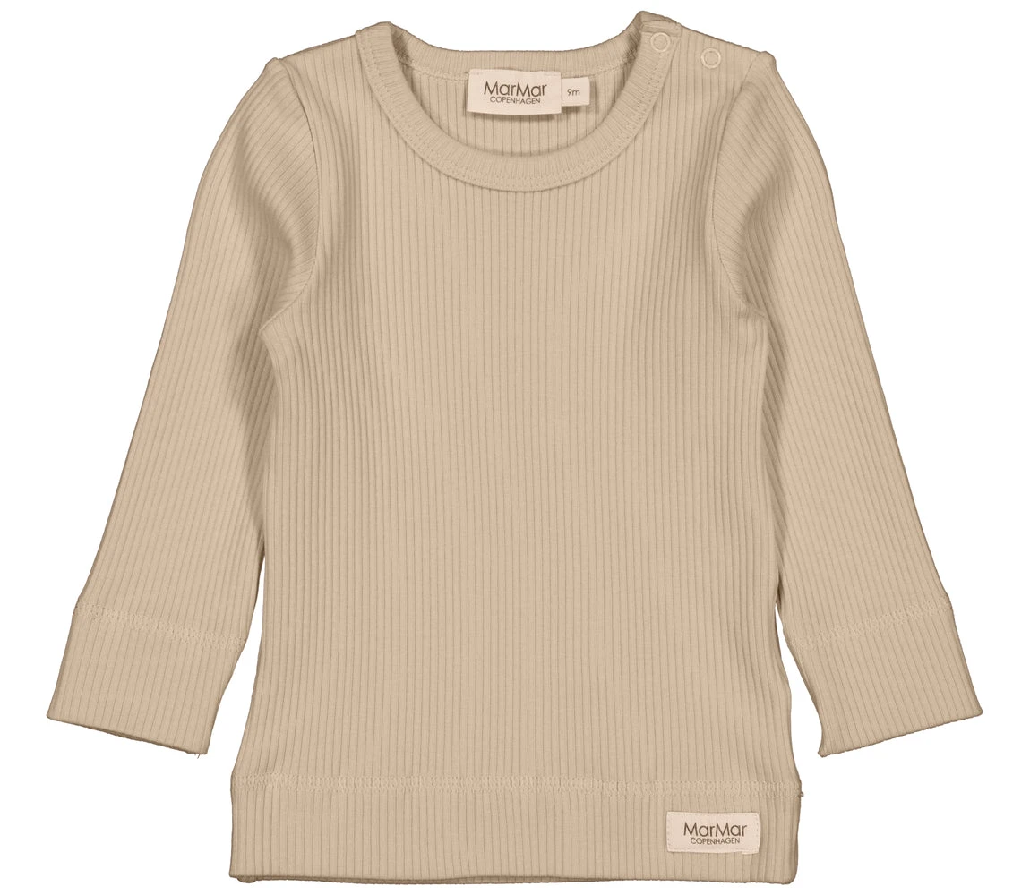 Simple long-sleeved modal t-shirt. The t-shirt is ribbed, soft, holds its shape and color and has elastane in it, which makes it stretchy and comfortable to wear.