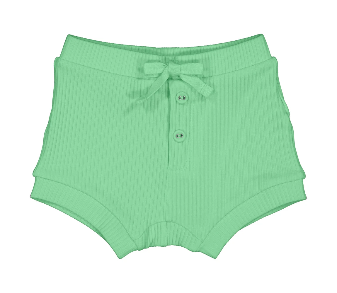 Small bloomers with a button placket and a decorative ribbon at the waist. The bloomers are ribbed, soft, hold their shape and color and have elastane in them which makes them stretchy and comfortable to wear.