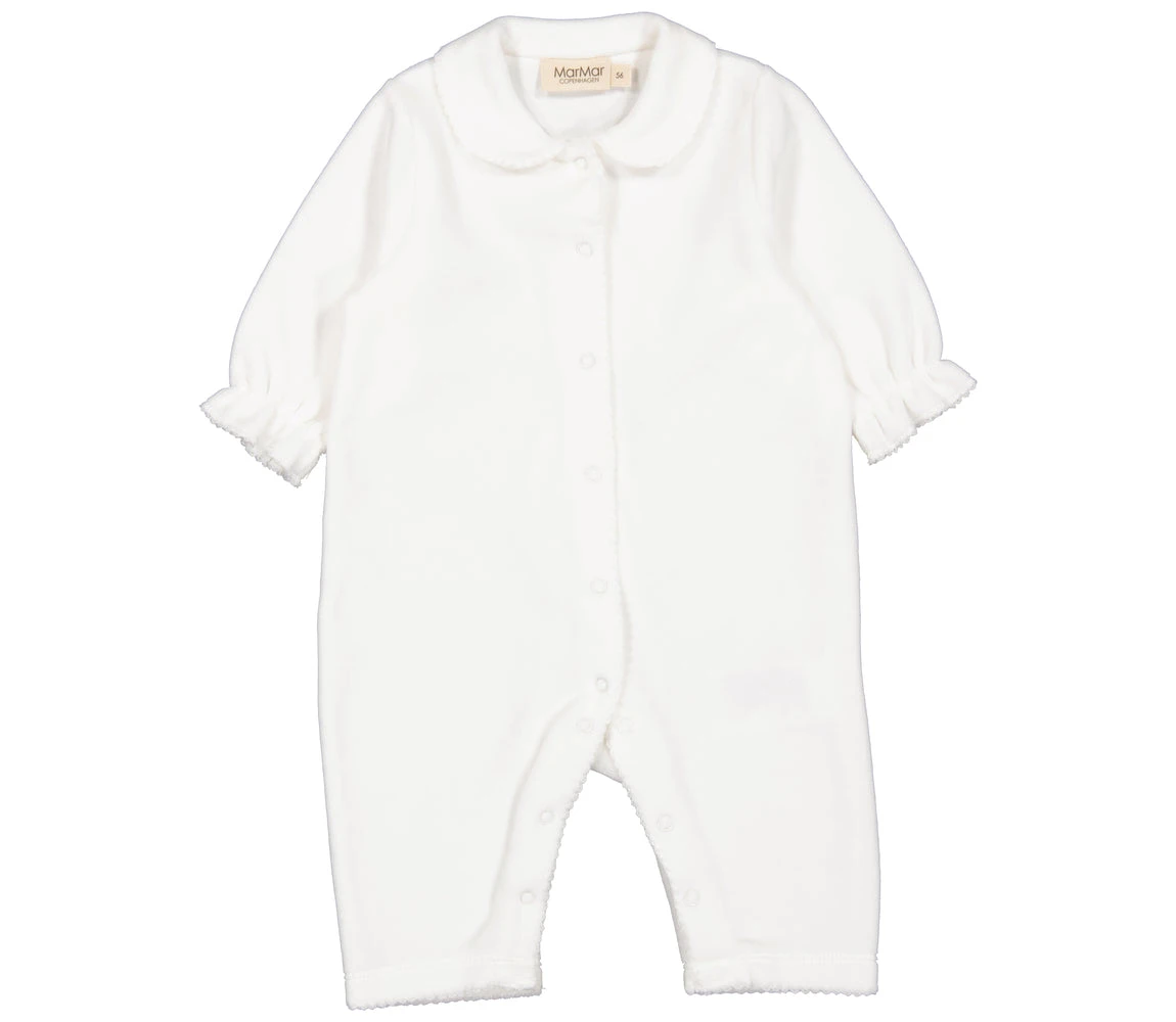 Long-sleeved jumpsuit for newborns. The jumpsuit has a cute little collar and closes with snaps.