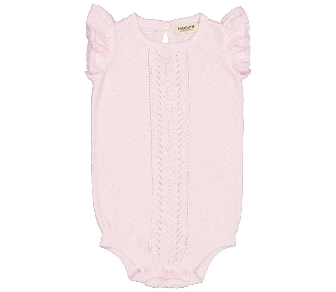 Short-sleeved bodystocking with fine ruffle details on the sleeve, pointelle/lace details and button closure at the back and between the legs for easier diaper changes.